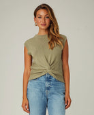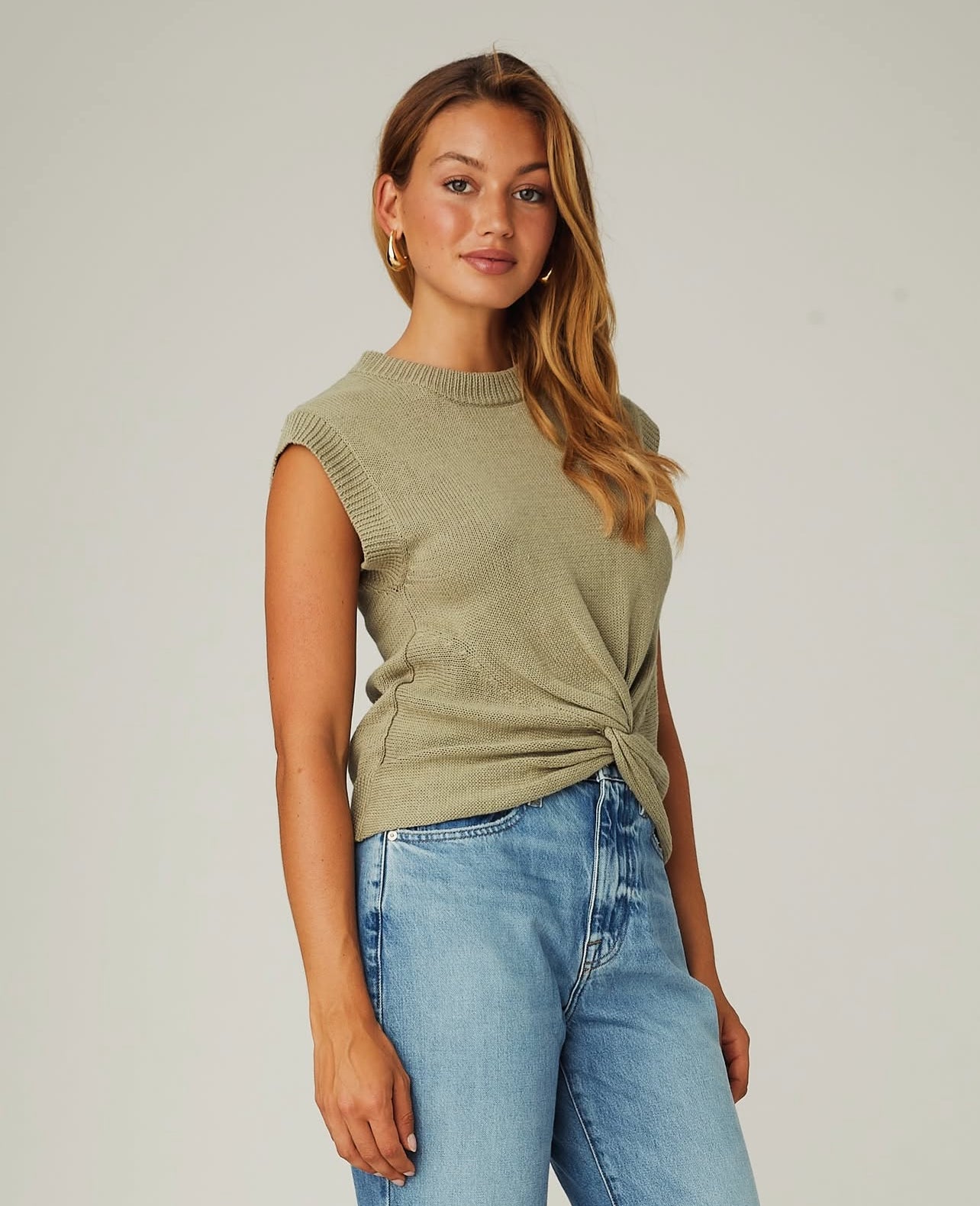 Embrace cozy-chic comfort with our Blended Reverse V Sweater. This sleeveless knit sweater features a unique twist front design and comes in a trendy sage green color. Perfect for adding a touch of playfulness to your outfit. (Get ready for serious sweater weather style!)