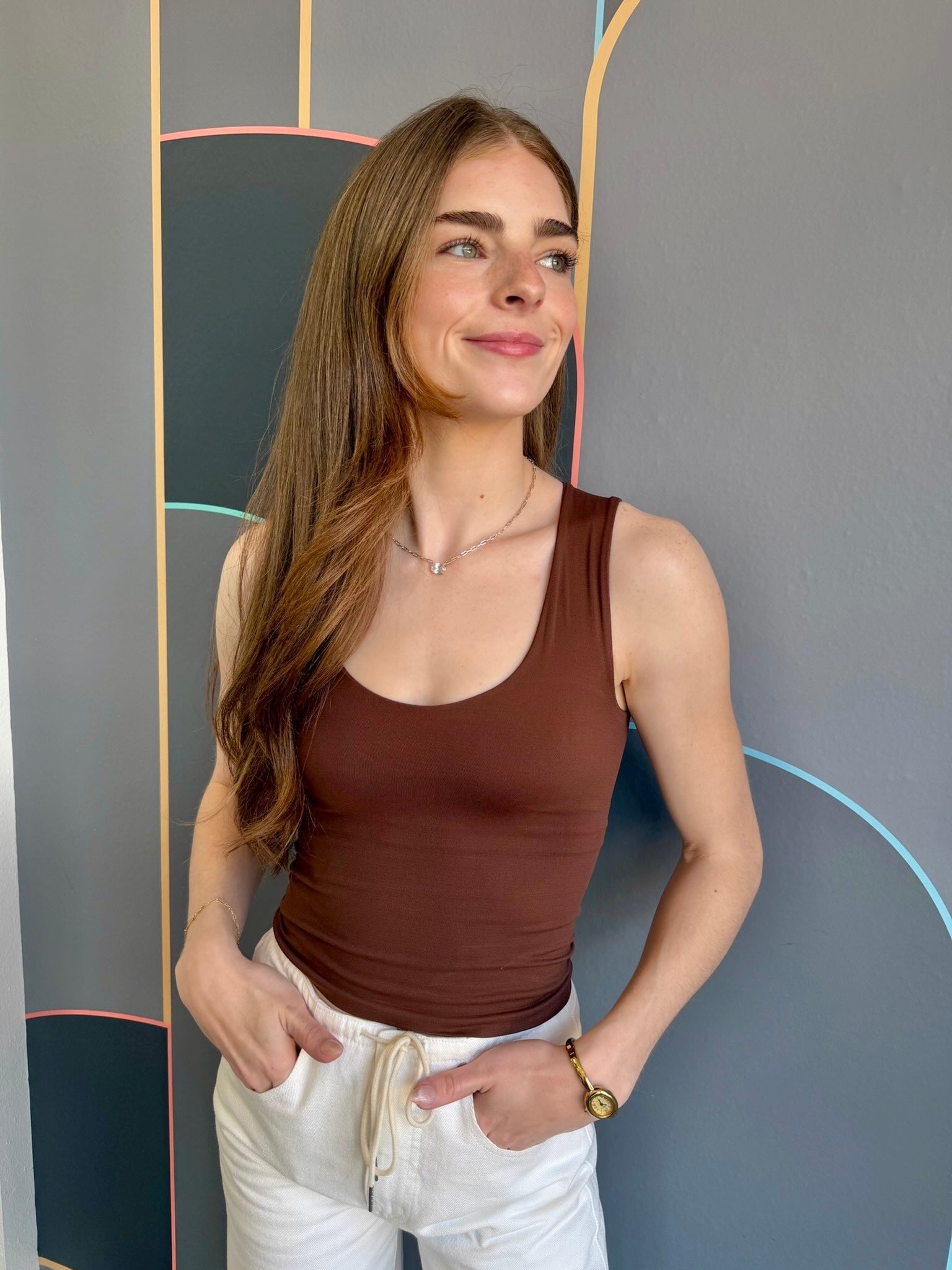 Features: Buttery soft fabrication with a stretchy feel, scoop-neckline, seamless design, wide shoulder straps