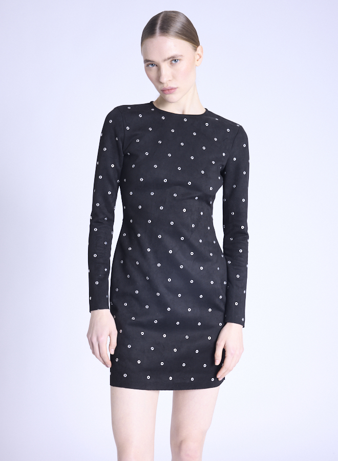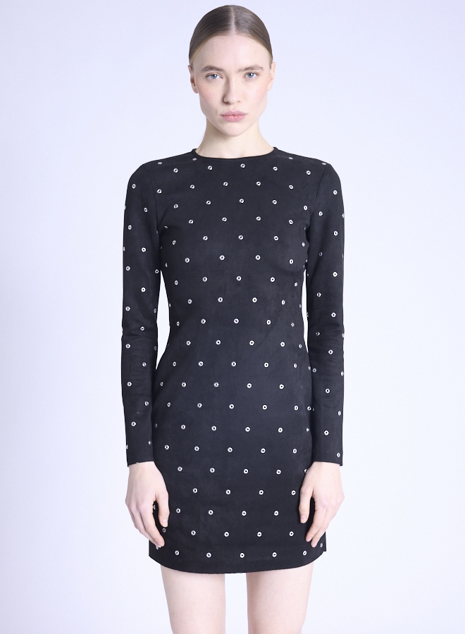 The Court Suede Rivet Dress offers a sleek, casual look with its soft suede fabric and eye-catching rivet details. Featuring long sleeves and a mini length, this black dress combines comfort and style for everyday wear or nights out. Its design ensures you stay effortlessly chic while enjoying all-day ease.