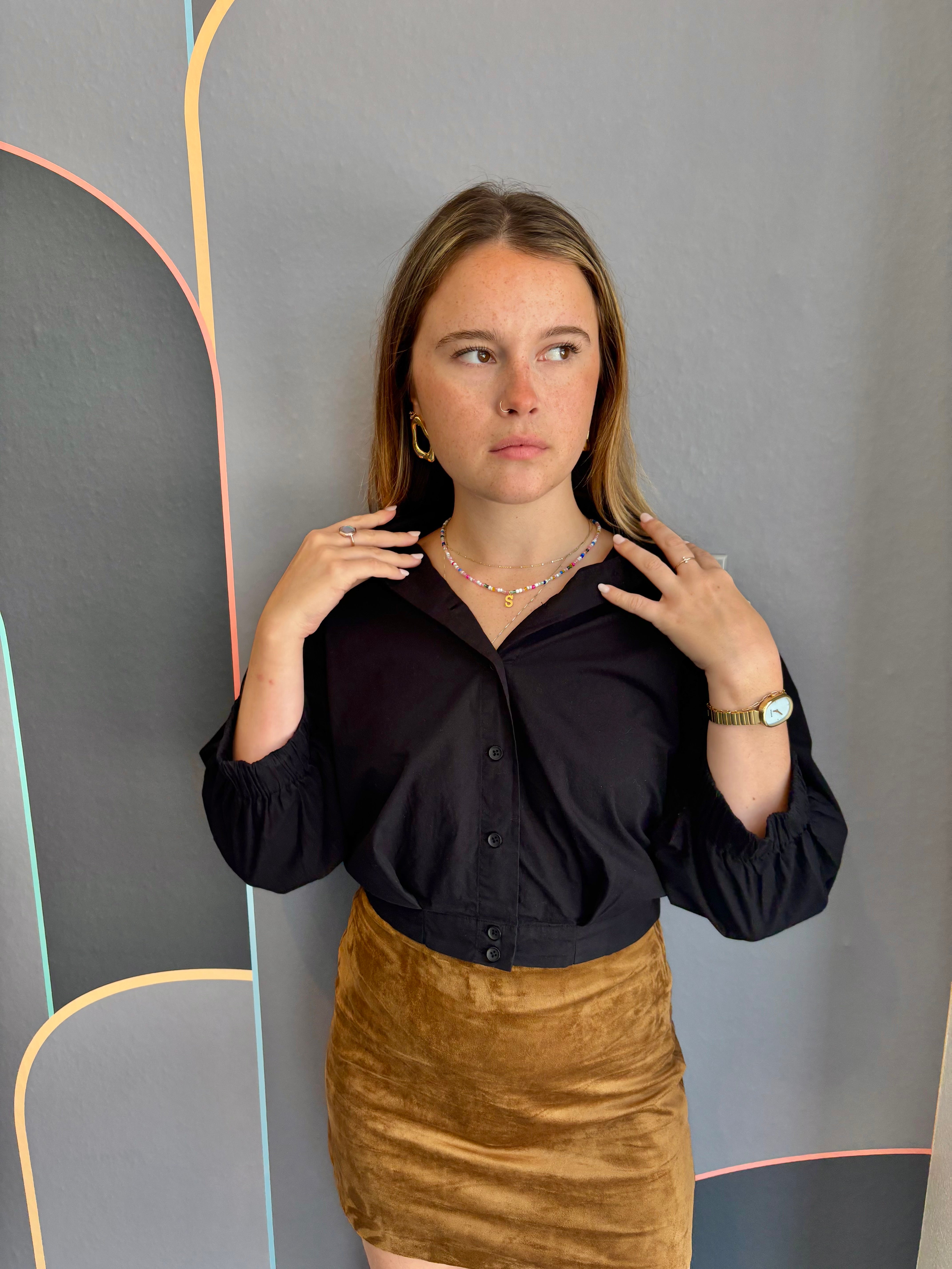 This black cropped top features charming puff sleeves and a button-front design, blending casual style with a trendy silhouette. Its flattering cut pairs effortlessly with high-waisted jeans or skirts, making it a versatile addition for everyday wear. Enjoy a comfortable, breezy fit that elevates your casual outfits with a subtle touch of elegance.