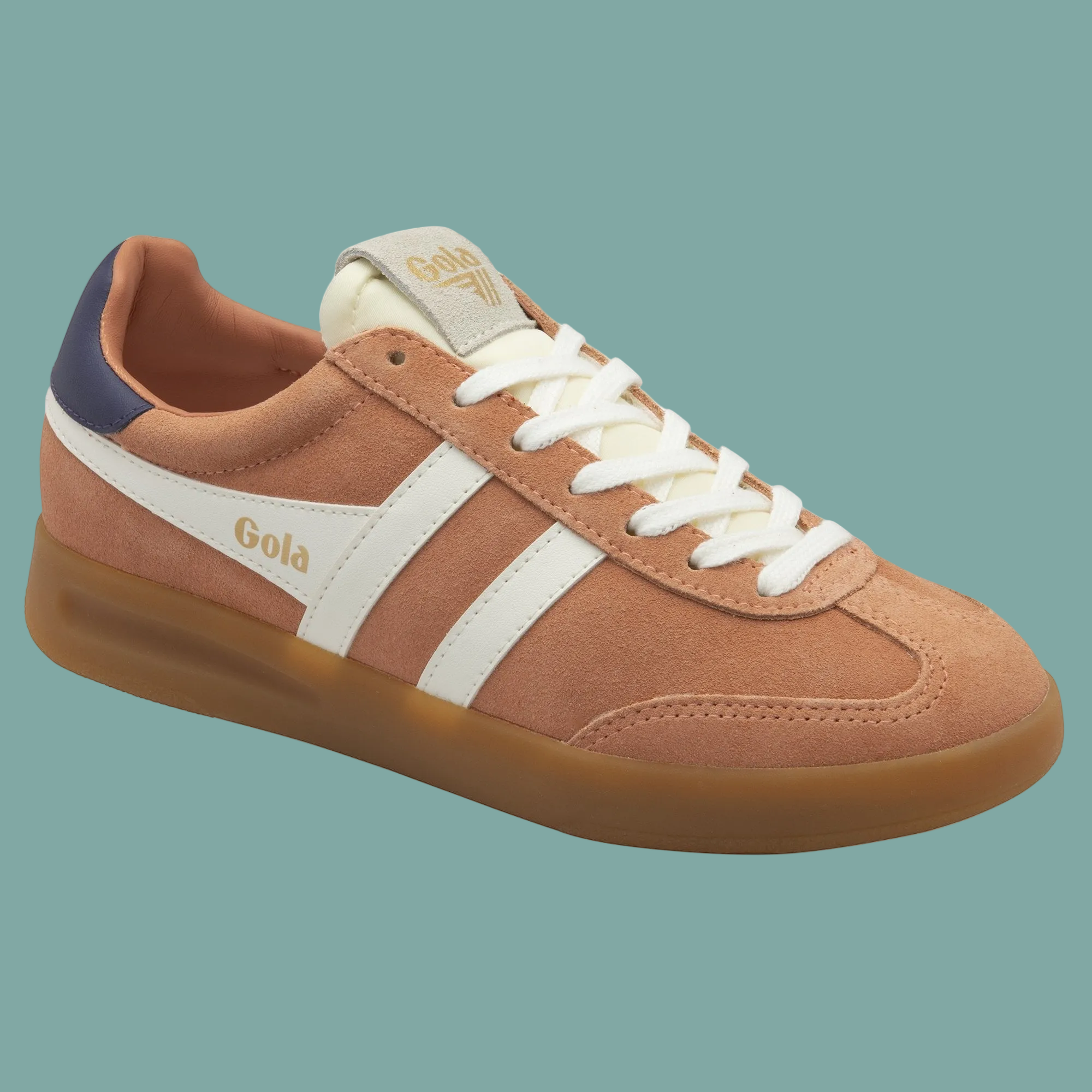 Gola's iconic Cyclone sneaker returns with a fresh seasonal palette that celebrates contemporary color trends. This women's style blends warm terracotta and soft off-white suede with subtle plum accents, creating a sophisticated yet playful aesthetic. The signature Gola side wingflash branding and translucent gum sole complete the design, making these sneakers a versatile choice for anyone seeking a modern take on a classic silhouette. Perfect for building outfits around the season's most coveted color combinations.