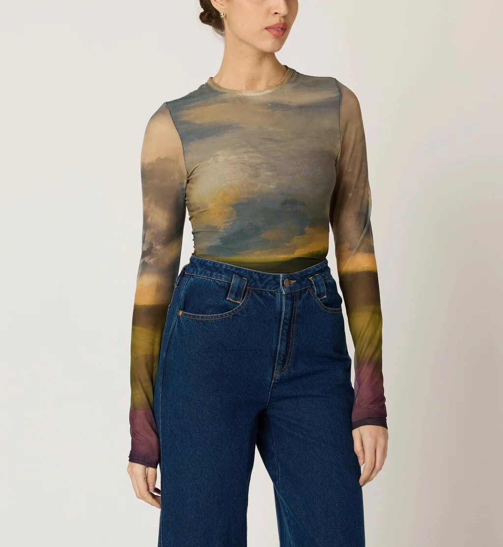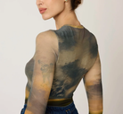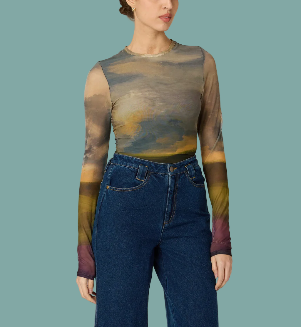 Ethically handmade in India from 88% recycled nylon and 12% elastane, the Dawn Top is a sustainable statement piece for your fall wardrobe. This fitted mesh long-sleeve top features a one-of-a-kind hand-painted design, blending artful detail with modern versatility. Style it with denim for an everyday look or layer it under a blazer for an elevated edge.
