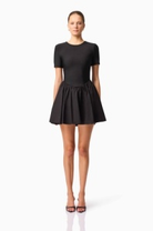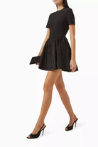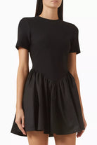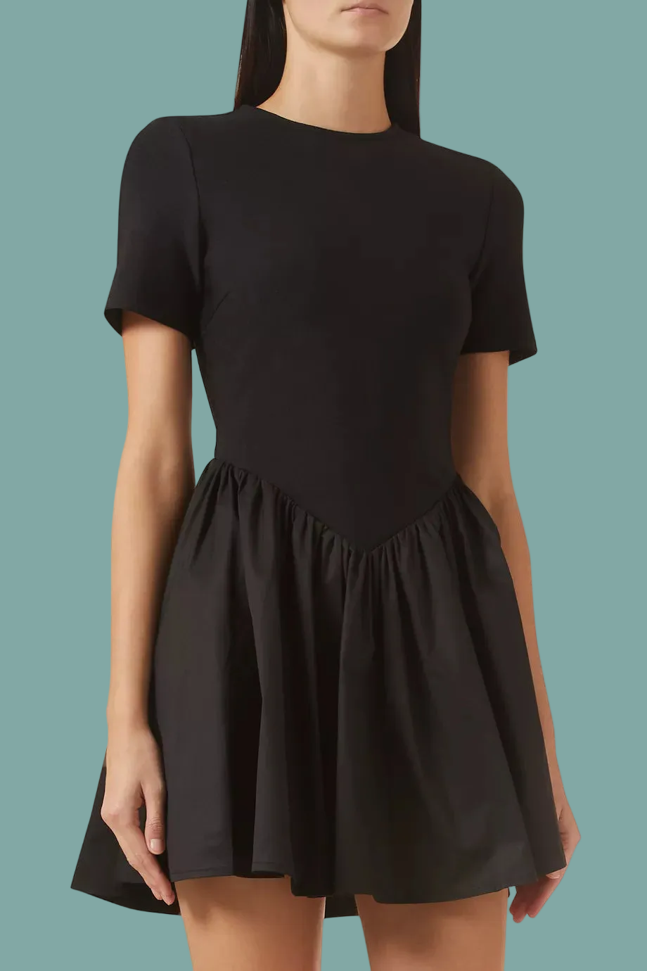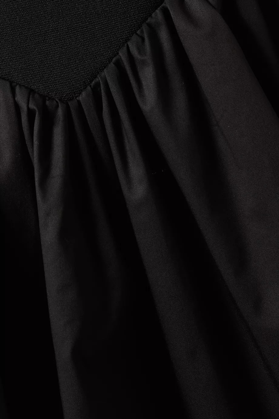 Rendered in a black hue, the dress brings a timeless elegance that complements a variety of skin tones and settings. The contrast cotton skirt introduces texture and dimension, giving the dress a unique edge. The woven cotton skirt has no stretch, creating a structured, crisp silhouette that beautifully balances the softness of the knit bodice. Thoughtfully finished with an invisible zipper at the center back for a seamless fit and side seam pockets for added functionality.