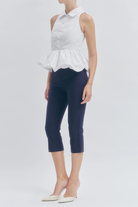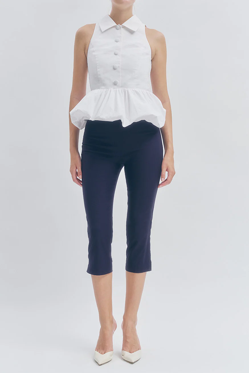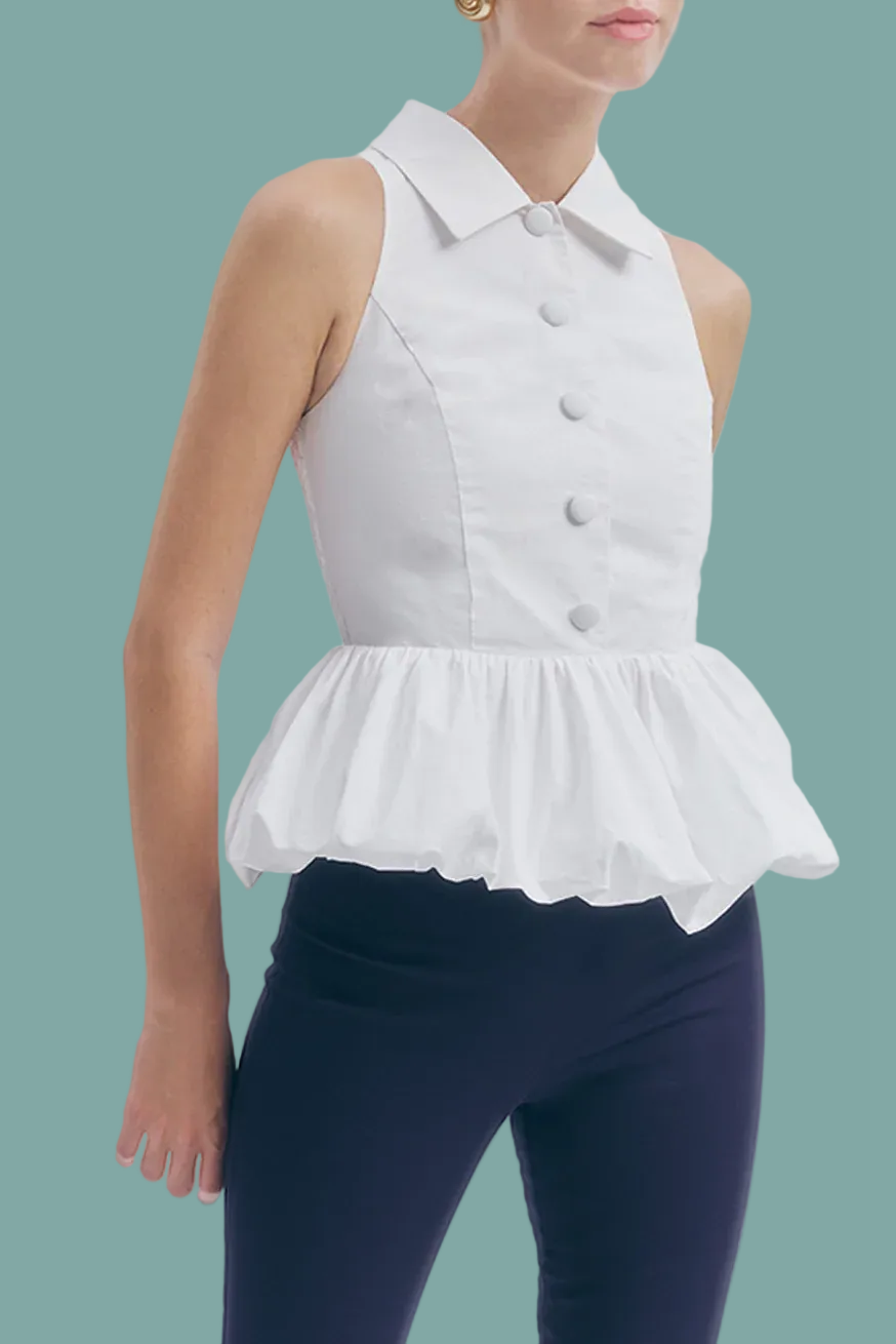 The Fallon Top is a chic cotton collared halter with a playful bubble hem that adds movement and dimension. Featuring a center back zipper for easy on-and-off wear, this mid-weight piece combines structure with comfort thanks to smocked side panels that provide gentle stretch. Decorative buttons add visual interest without functional closures. Crafted from 100% cotton with a cotton lining, this imported style is perfect for elevated casual looks. Dry clean only.