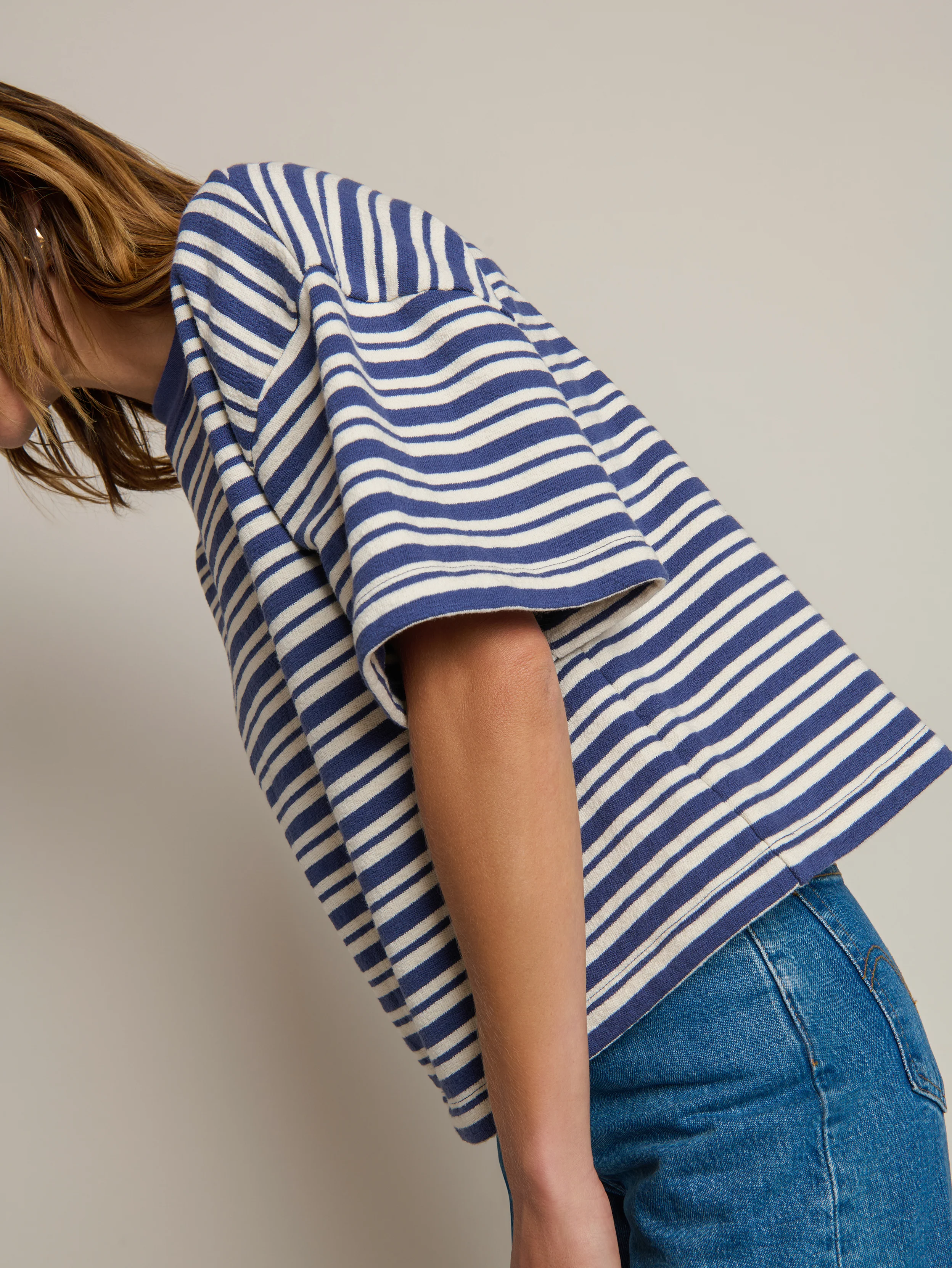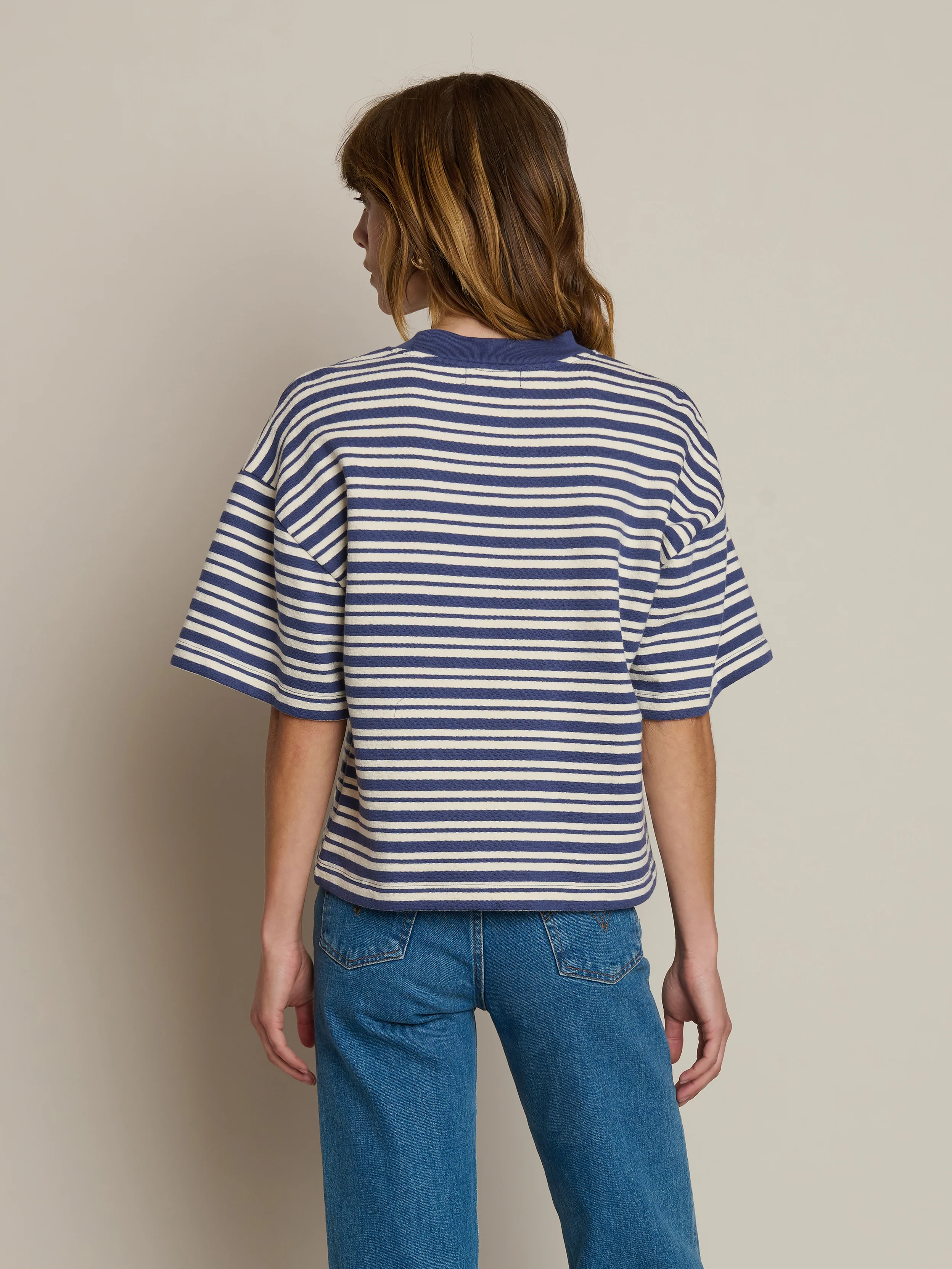 The Gio Sweatshirt brings effortless tomboy style with its boxy, cropped silhouette crafted from 100% cotton soft brushed fleece. The ribbed mock neck and short sleeves make layering a breeze or pair it with high-waisted bottoms for a polished French tuck. Finished in a playful Tossed Stripe pattern, it's the perfect casual essential that works as hard as you do.