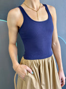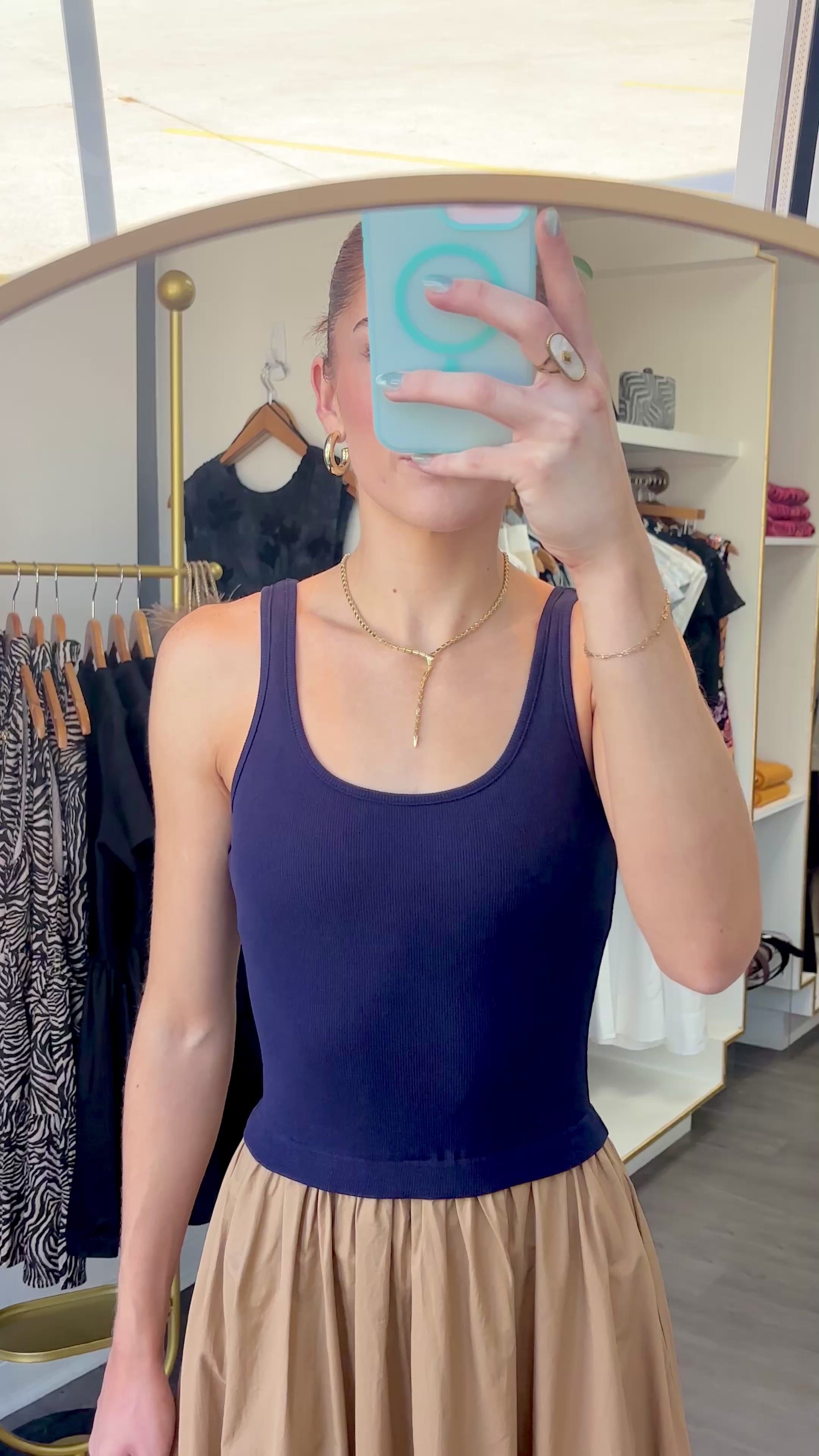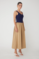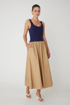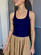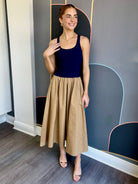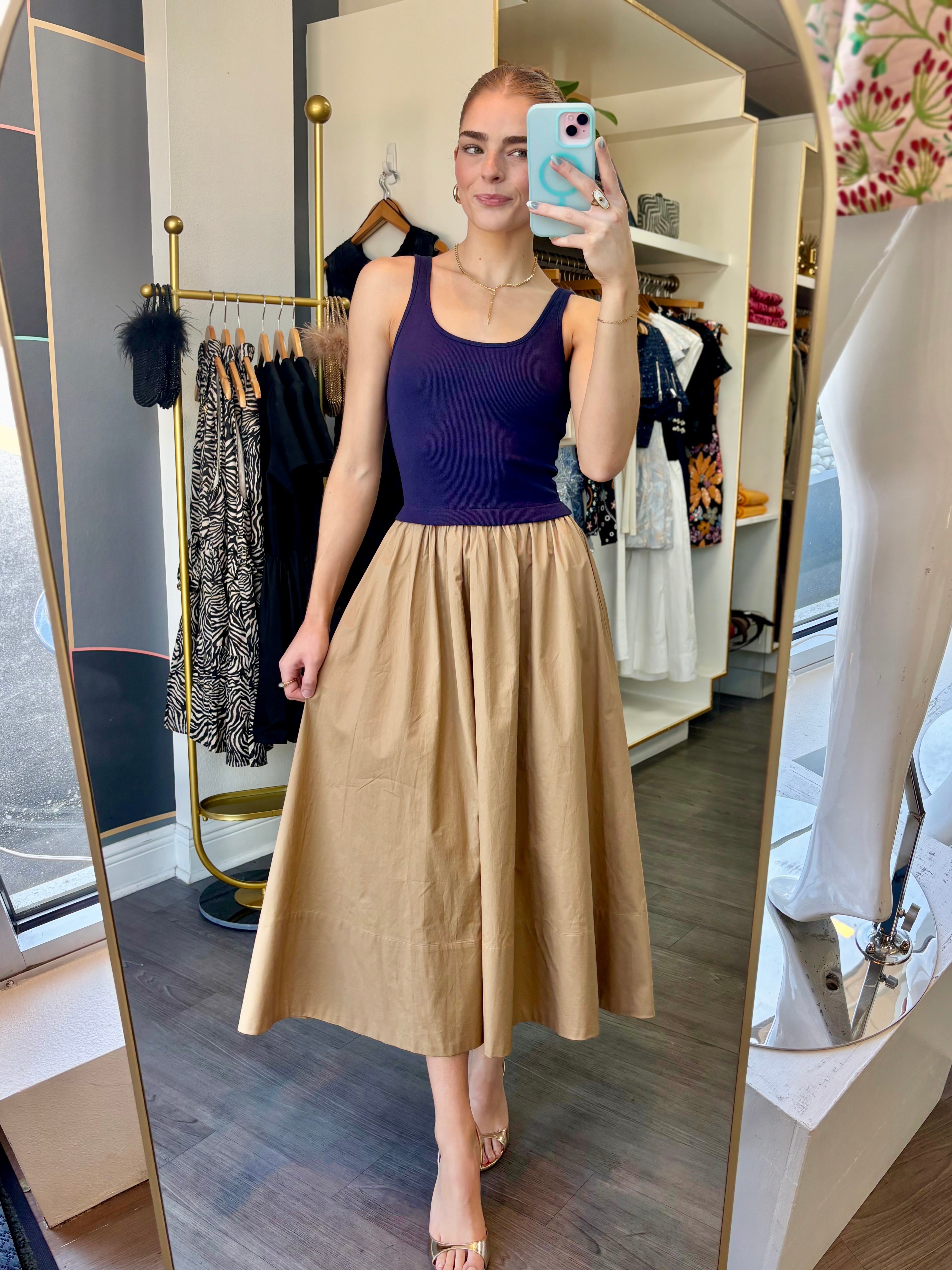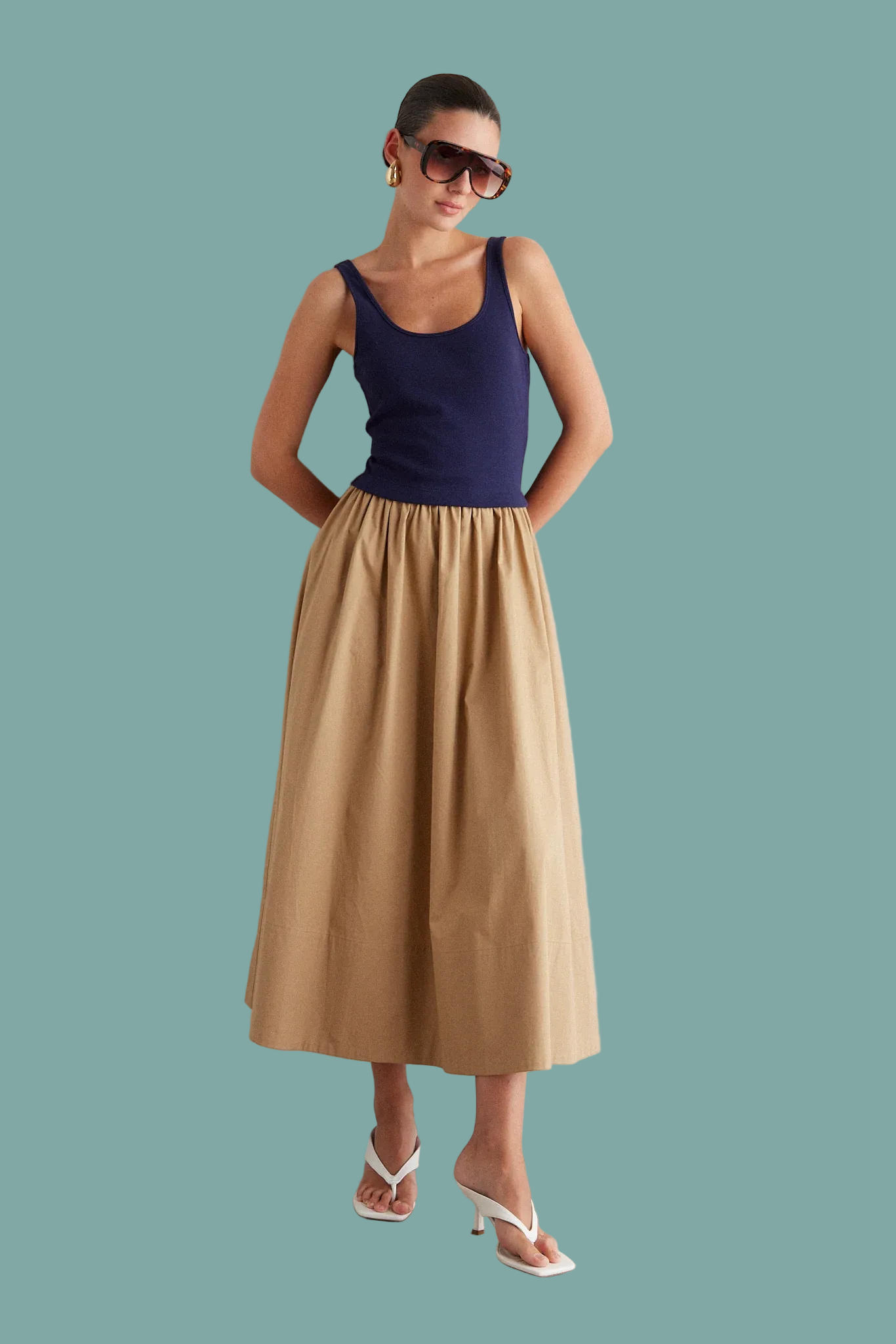 The Gracen dress brings together two classic pieces in one effortless design. A structured navy ribbed tank meets a crisp khaki cotton poplin skirt, creating a balanced look that works from morning meetings to evening plans. The mixed-fabric approach keeps things interesting while staying grounded in timeless neutrals. Tailored without feeling stiff, it's the kind of dress that feels as good as it looks.