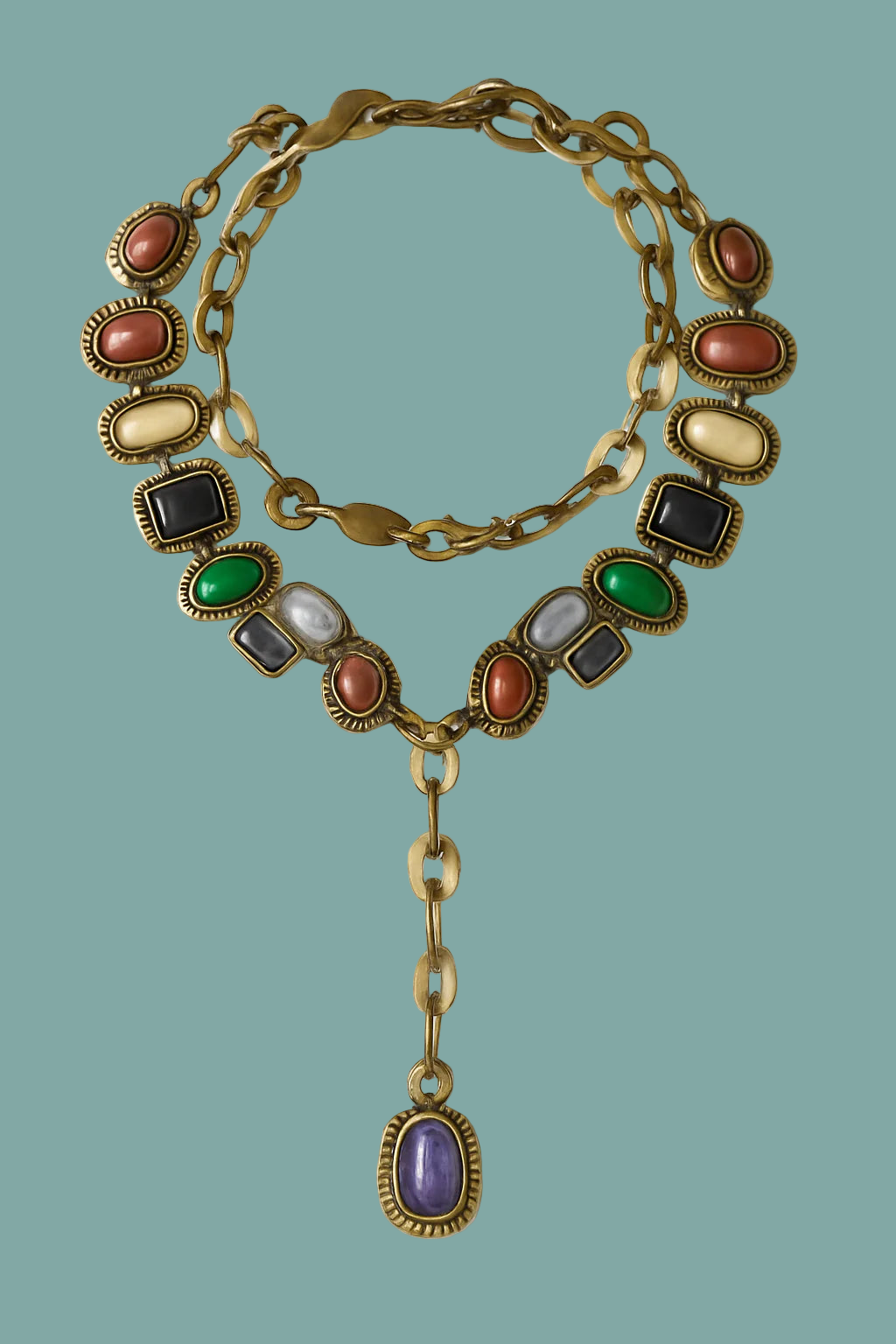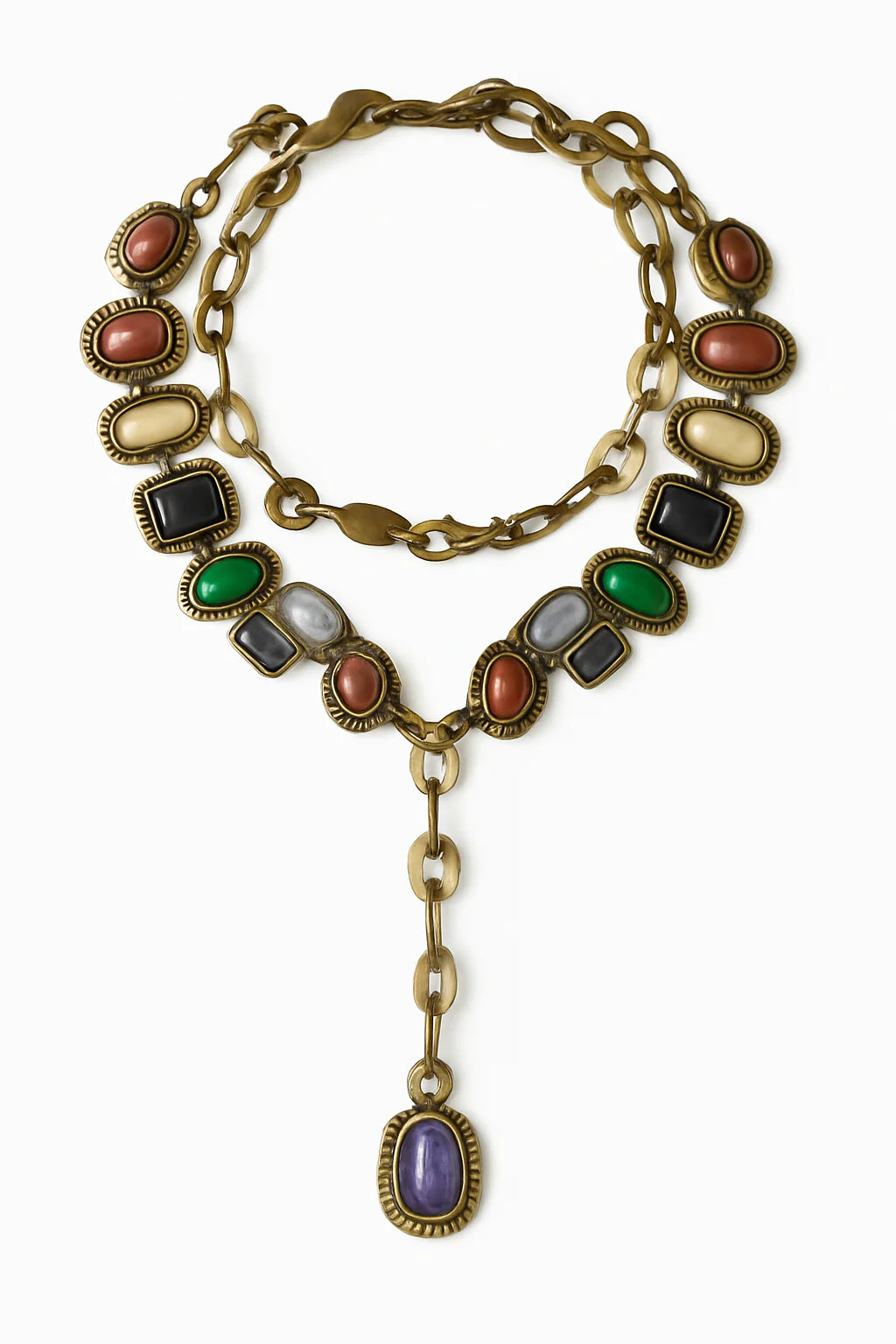 The Jane Necklace features a 31-inch length with a stylish retro gemstone wrap design. Crafted from brass, this necklace adds a unique vintage touch to any outfit. Please note, it is not waterproof, so avoid exposure to water to maintain its shine and quality. Perfect for casual wear, it effortlessly blends charm and timeless style.