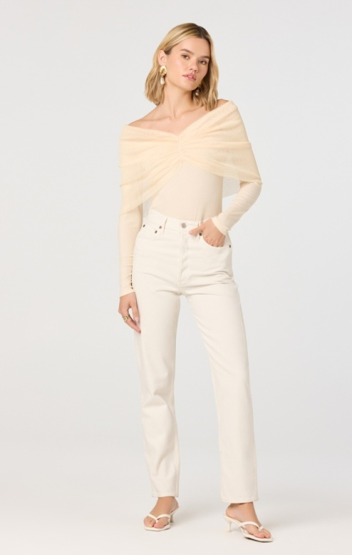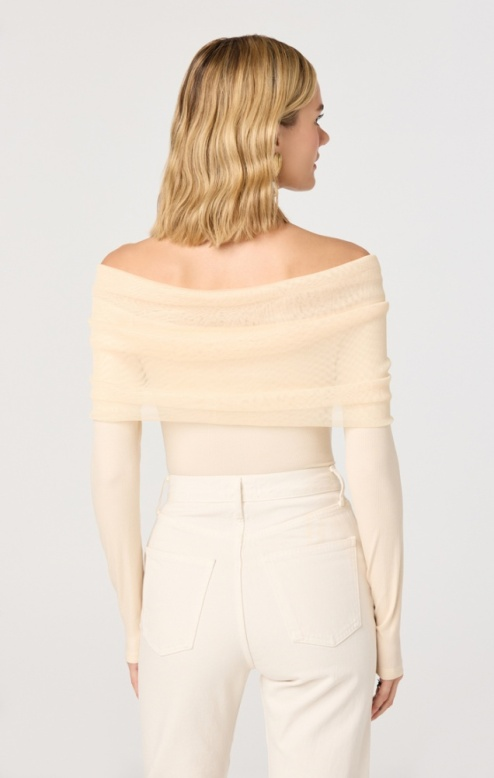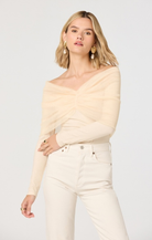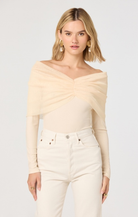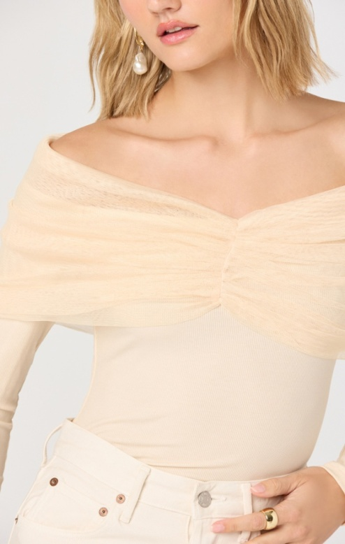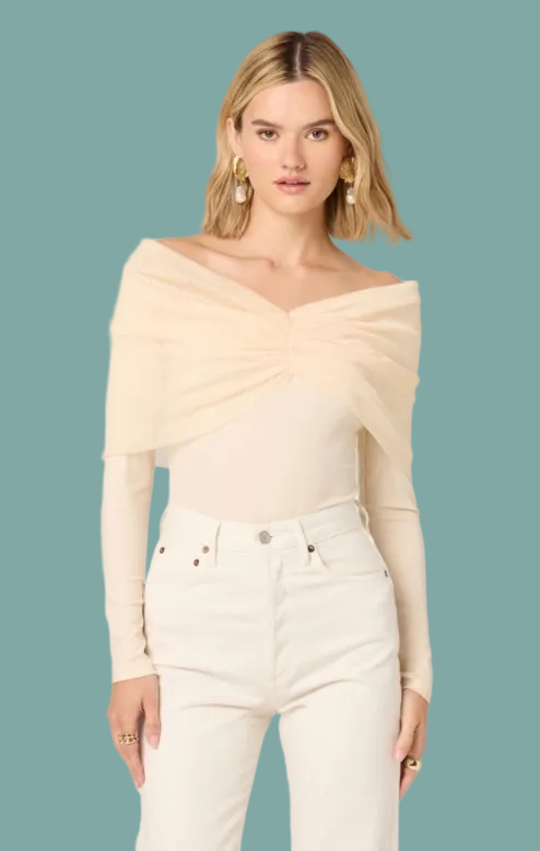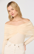 The Julieta Top blends effortless elegance with modern style. This off-the-shoulder long sleeve features a delicate chiffon overlay in soft cream, creating beautiful dimension and movement. The mixed media construction combines structured and flowing fabrics for a flattering silhouette that works for casual outings or dressed-up occasions. Perfect for layering or wearing solo, this versatile piece adds a touch of sophistication to any wardrobe.