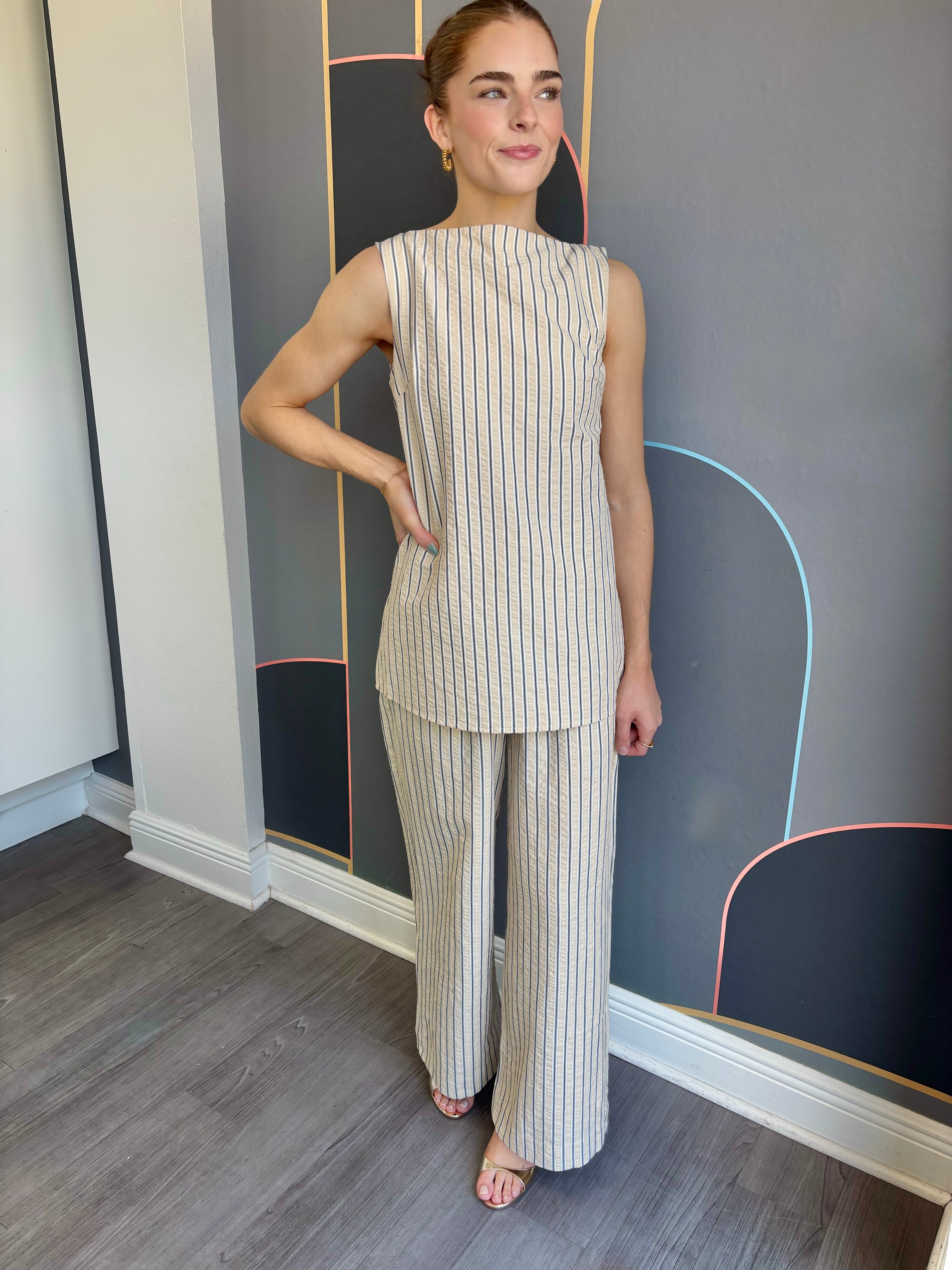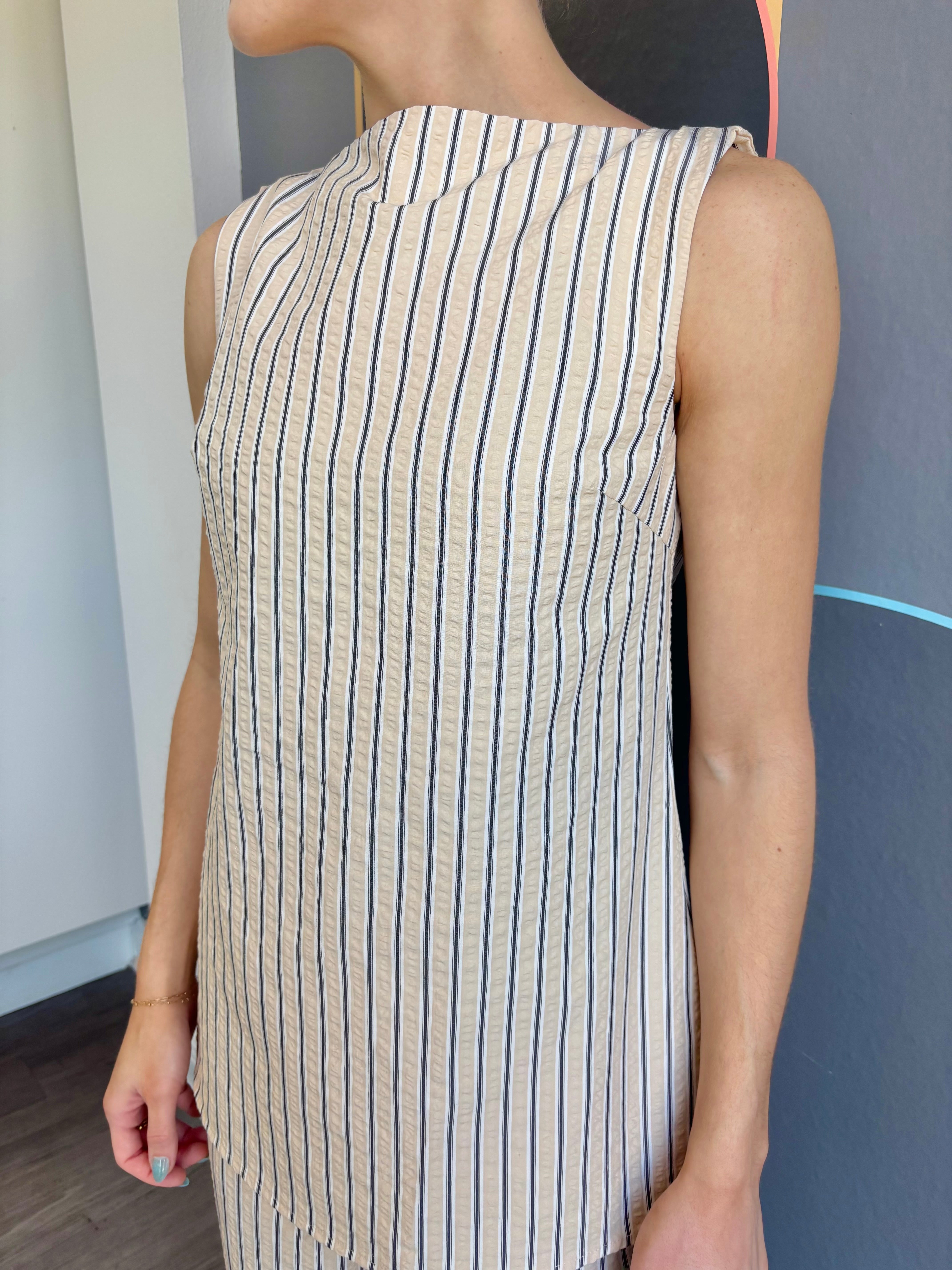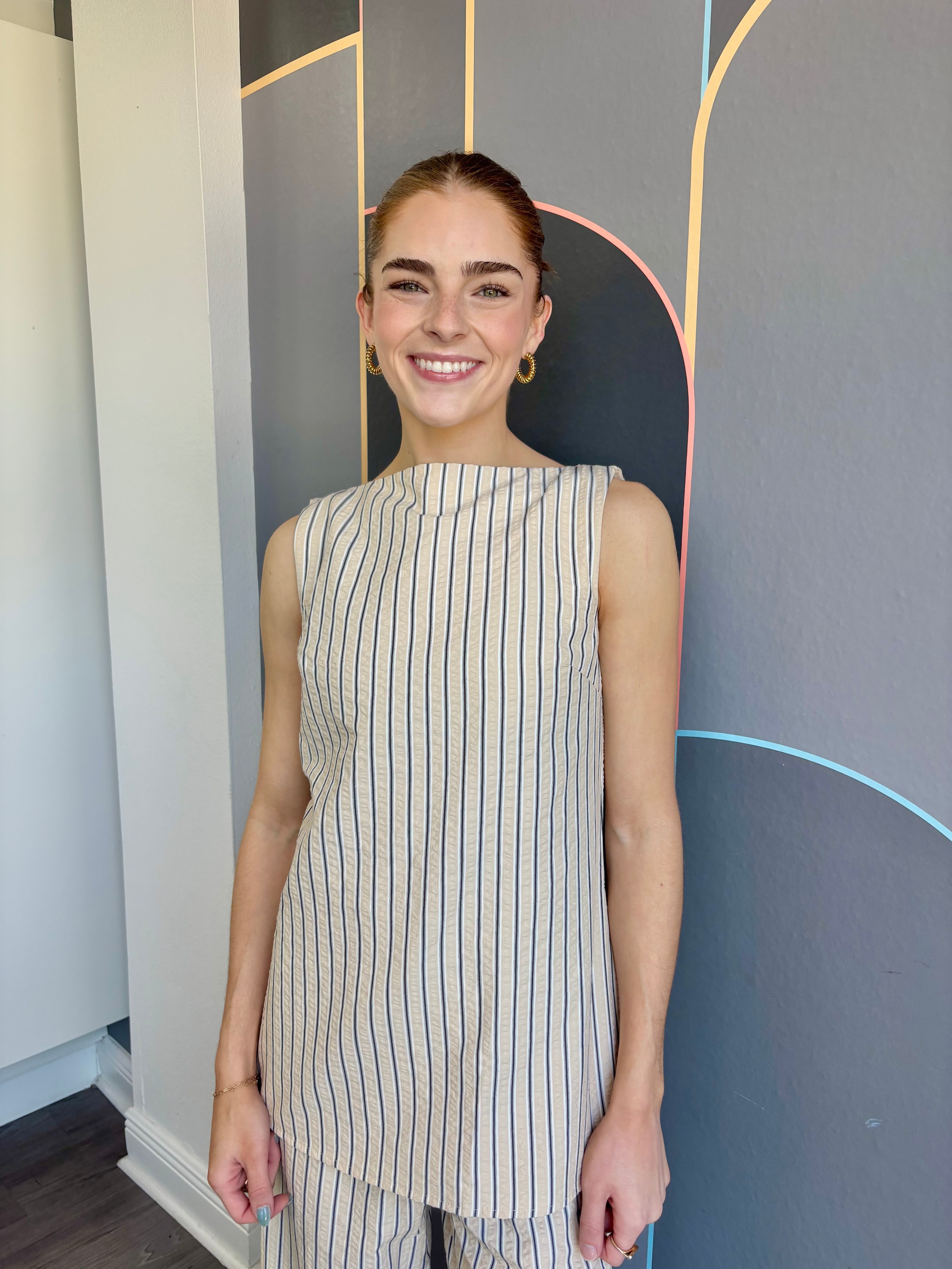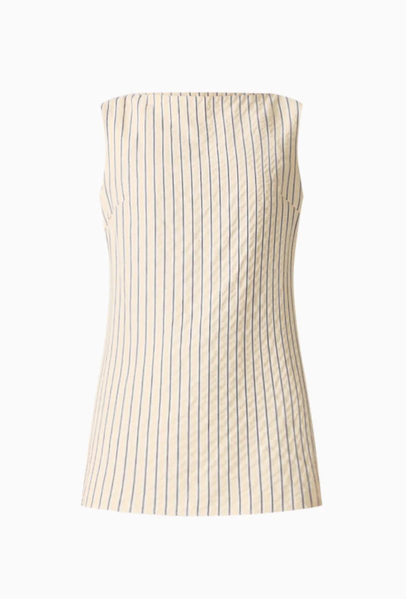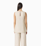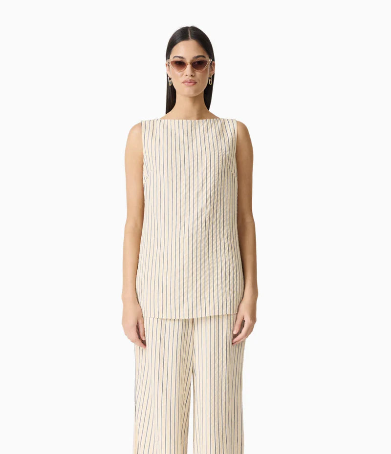 Effortlessly refined and easy to wear, this sleeveless top features a classic boat neckline and a relaxed, modern fit. Designed in a lightweight woven fabric with no stretch, it offers a clean, structured silhouette. Thoughtful details include a center back button with elastic closure and subtle side splits for added movement and comfort. A versatile staple that pairs perfectly with everything from tailored trousers to your favorite denim
