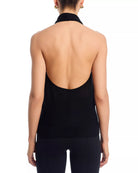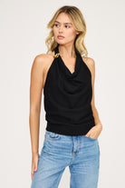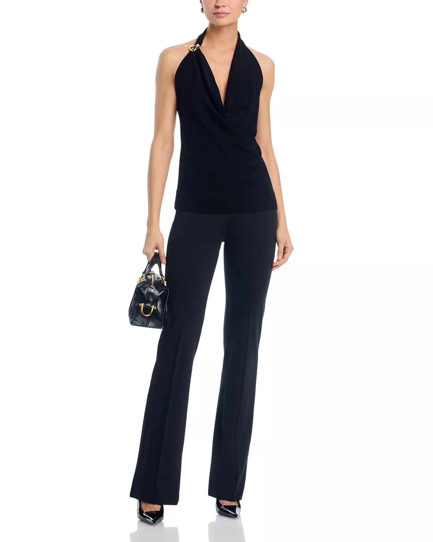 • Twisted halter neckline with gold-tone hardware