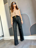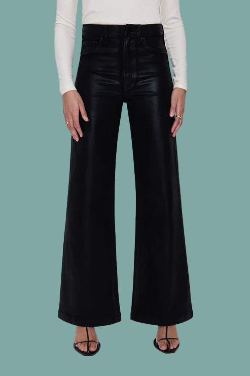The Lana High Rise Ultra Wide Leg Jean makes a bold statement with its dramatic wide-leg silhouette and relaxed fit. Sitting high on the waist, it features a full-length 33" inseam that flows effortlessly with every step. Made from our signature comfort stretch denim in Coated Noir, these jeans offer a rich black finish with a sleek, textured look that’s perfect for elevating any casual outfit.