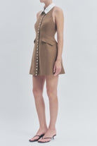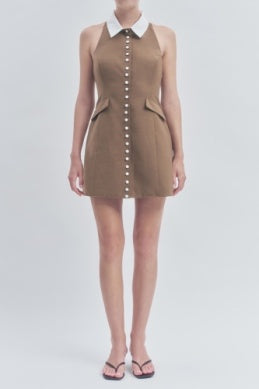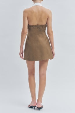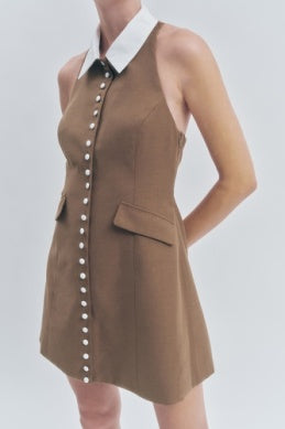The Leoni Dress combines effortless style with thoughtful construction. This collared halter mini dress features a button-down front, faux pockets, and a flattering silhouette. Crafted from a breathable blend of polyester, linen, and rayon with wool lining for comfort, the dress is finished with crisp cotton contrast details. Perfect for warm-weather occasions, this versatile piece transitions seamlessly from day to night.