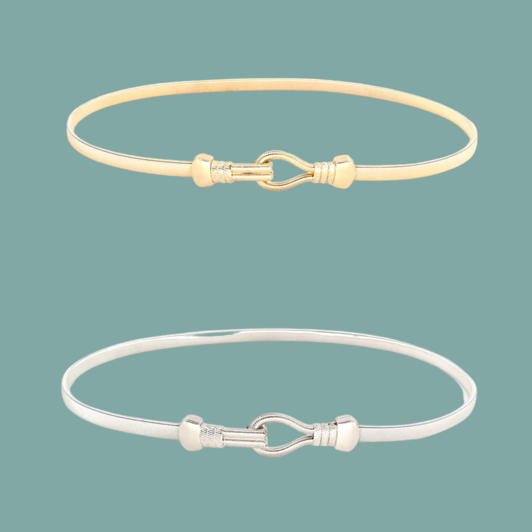 Looking for a funky, functional addition to your wardrobe? The Loop Clasp Belt features a gold or silver loop clasp and a thin design. Perfect for adding a touch of style to any outfit (and keeping those pants up)!