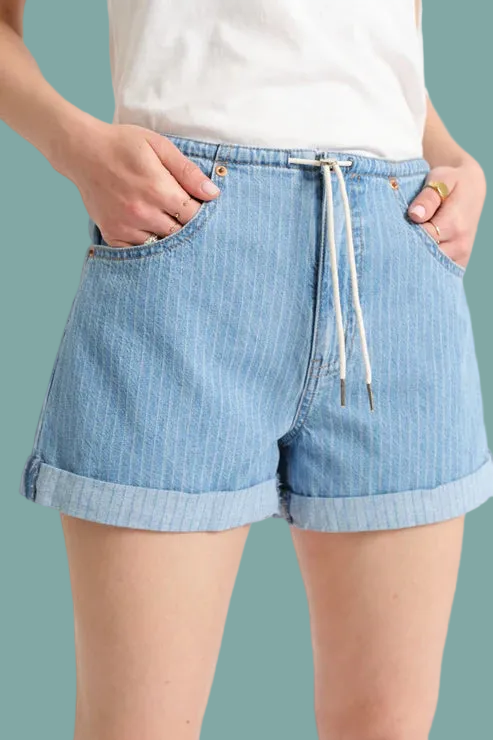 The Maddie in Whimsy is the perfect relaxed short. The mid-rise fit is tied together with a drawstring waist, and the wide leg fit features a light blue wash.