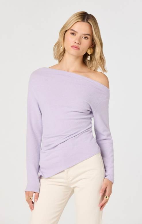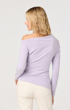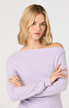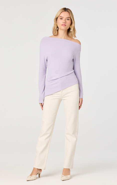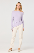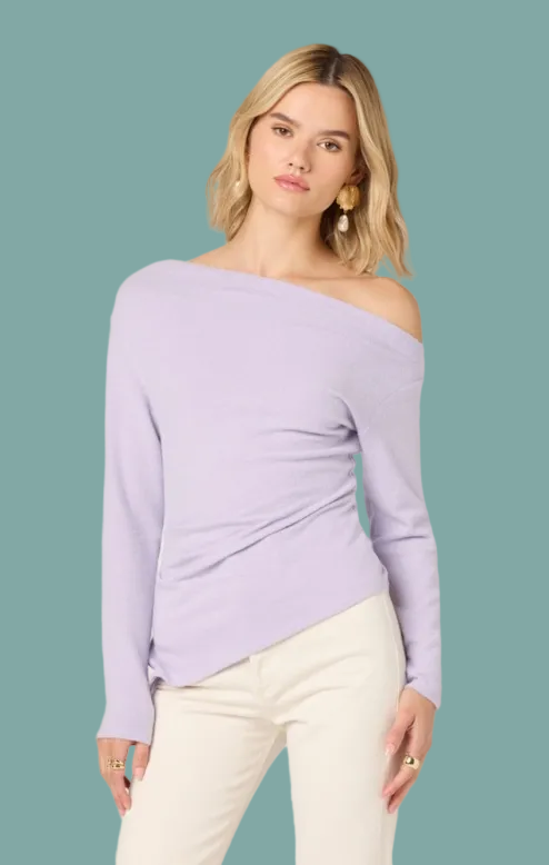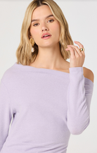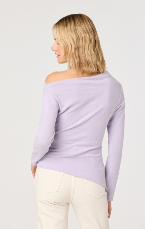 The Miah Top is an effortless layering piece that brings modern edge to your everyday rotation. This lilac off-the-shoulder design features an asymmetrical cut that drapes beautifully, creating flattering movement and dimension. The soft sweater knit feels cozy against skin while the trendy neckline keeps things fresh and contemporary. Perfect for pairing with jeans, skirts, or tailored trousers—dress it down for casual vibes or elevate it for nights out. A versatile staple that works harder than it looks.