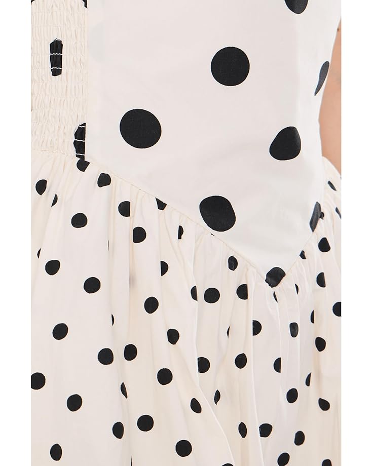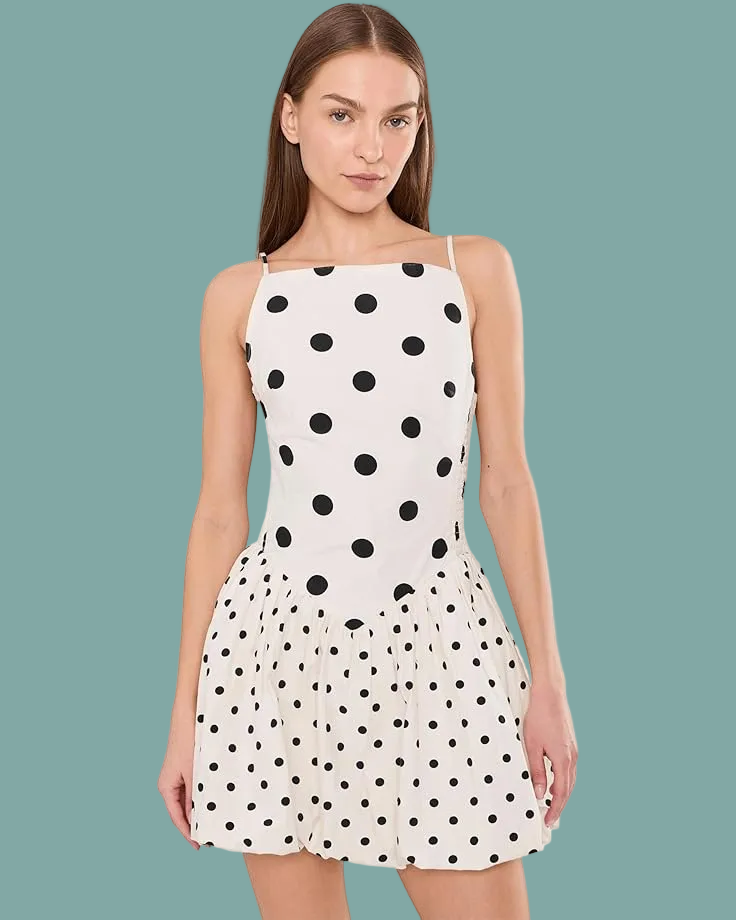 White and black sleeveless polka dot dress with bubble hem