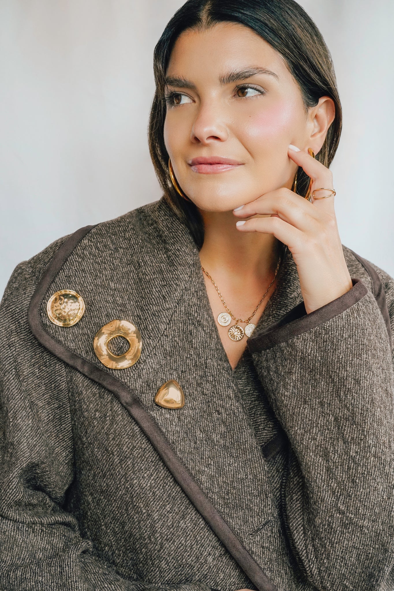 The newest trending accessory. Make your favorite coat even more amazingGold Wavy round brooch pin to liven up your favorite blazer! Wear alone or layer with our other brooches: Diana Brooch and Hazel Hammered Brooch