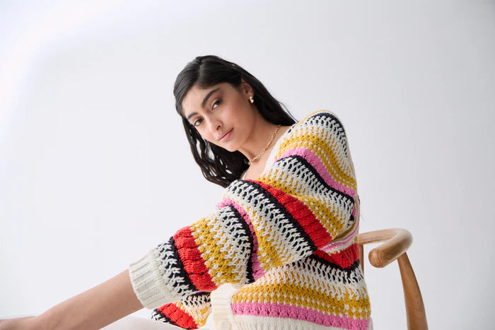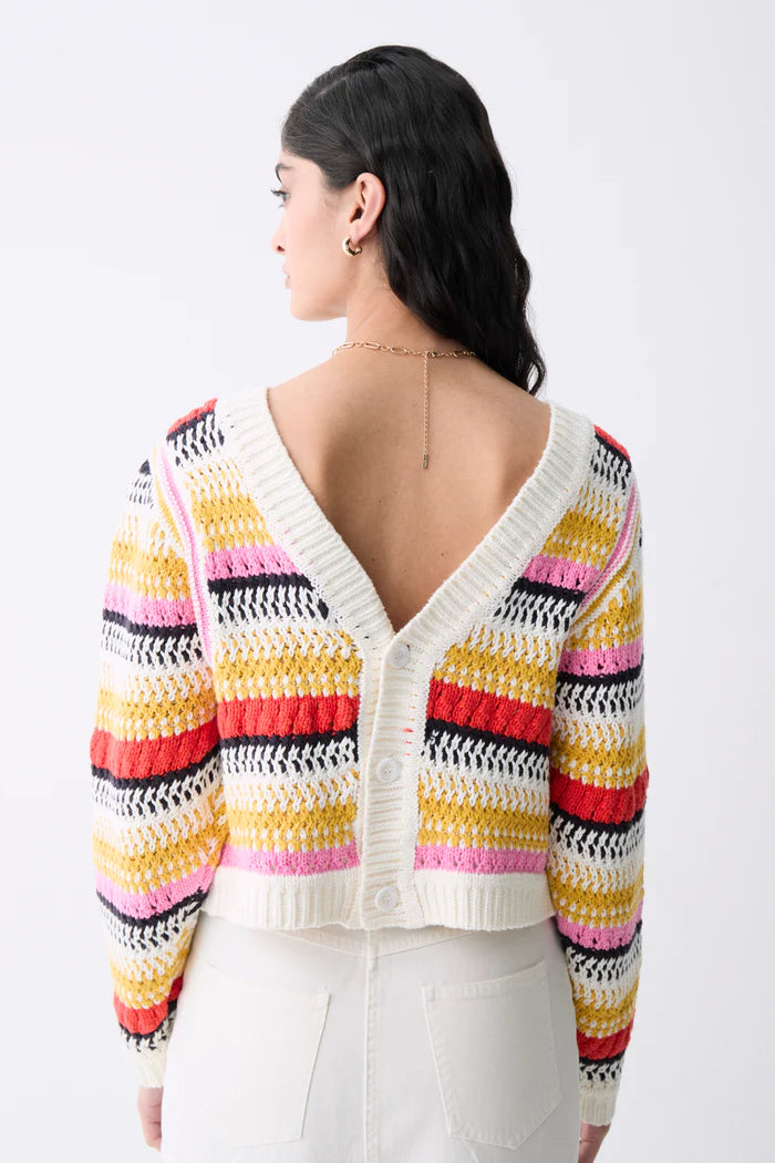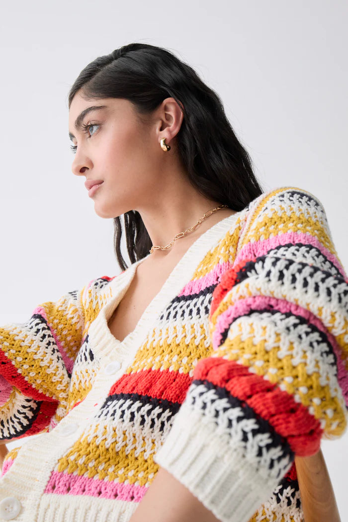 Cotton blend sweater with round neckline and long batwing sleeves. It can be used as a V neckline cardigan. Multicolor embossed knit. Button closure