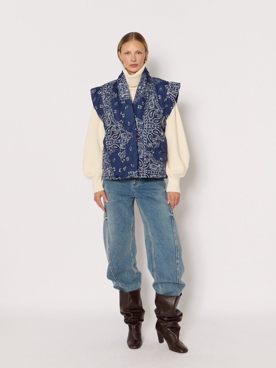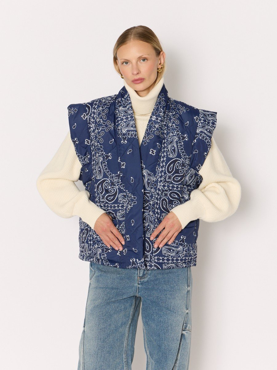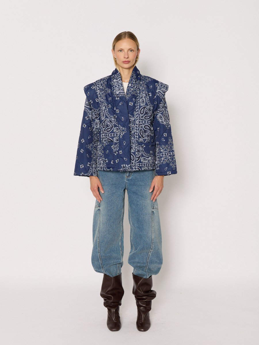 The Quilted Bandana Jacket brings a fresh streetwear vibe with its bold blue bandana print and comfortable quilted fabric. Its detachable sleeves offer versatile wear, letting you switch between a jacket and a sleeveless look effortlessly. Featuring front pockets for convenience, it’s perfect for creating a stylish urban outfit when paired with leggings or high-waisted jeans. Practical, comfortable, and effortlessly cool, this jacket makes a standout addition to your casual wardrobe.