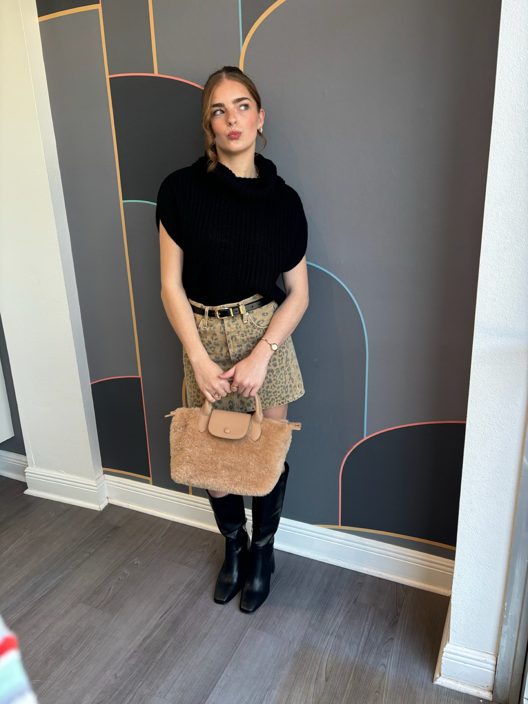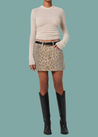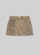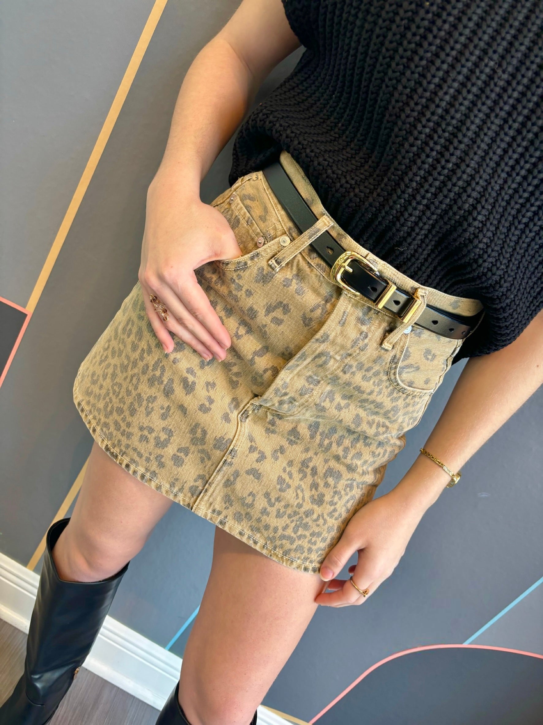 Looks Like: Light beige denim skirt with cheetah print and a clean hem