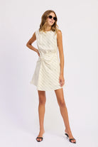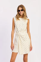 Crafted from a breathable linen and viscose blend, this mini sheath dress features elegant ruched draping and strategic stripe placement for visual interest. The fully lined design ensures comfort and coverage, while the flattering silhouette works for both casual outings and dressed-up occasions. Hand wash and imported for quality construction. Model pictured is 5'9" wearing size small.