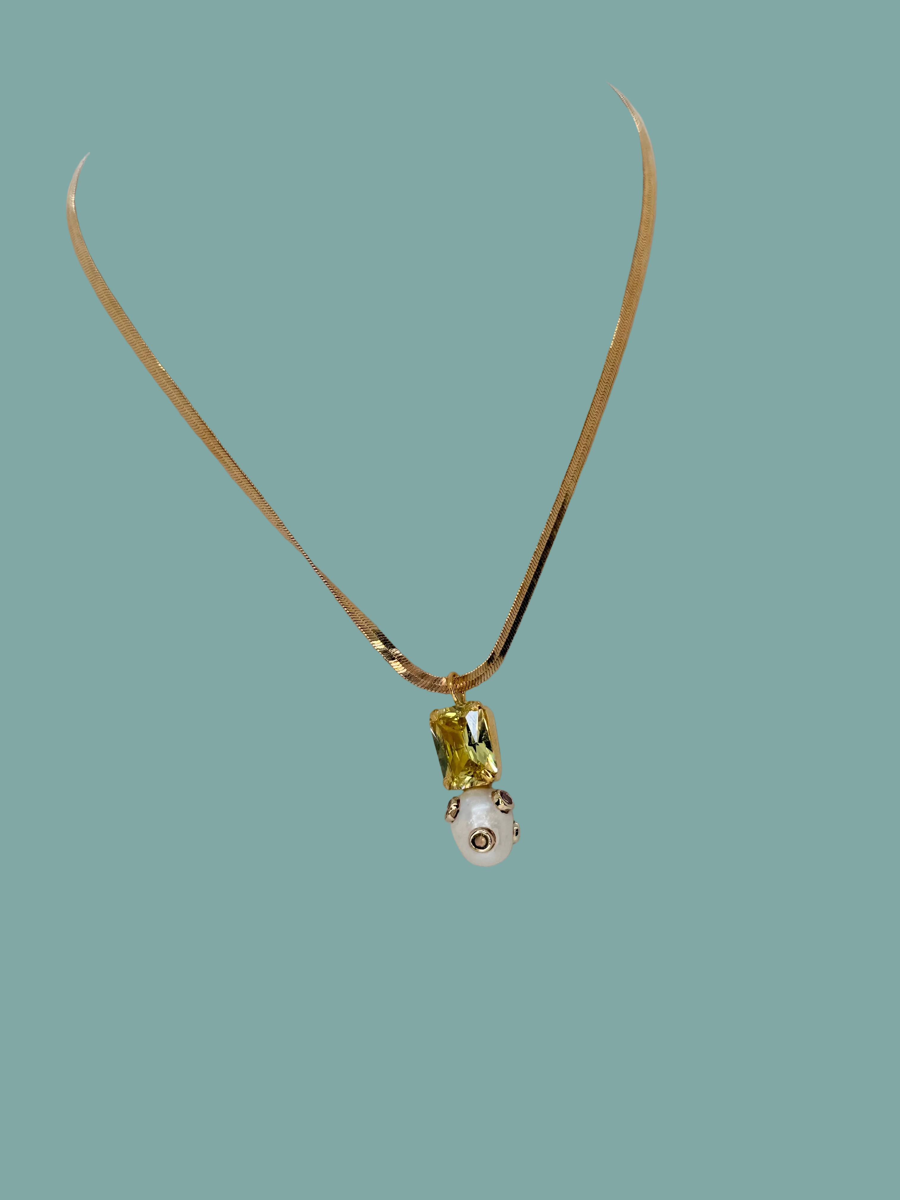 Elevate your everyday look with this stunning Royal Pearl Necklace. A radiant golden yellow emerald cut stone takes center stage, paired with a multicolored studded pearl charm that adds personality and flair. The whole piece glides effortlessly along a sleek snake chain, creating a balanced design that works as well with casual tees as it does with evening wear. Perfect for layering or wearing solo, this necklace brings just the right amount of sparkle and sophistication to any outfit.
