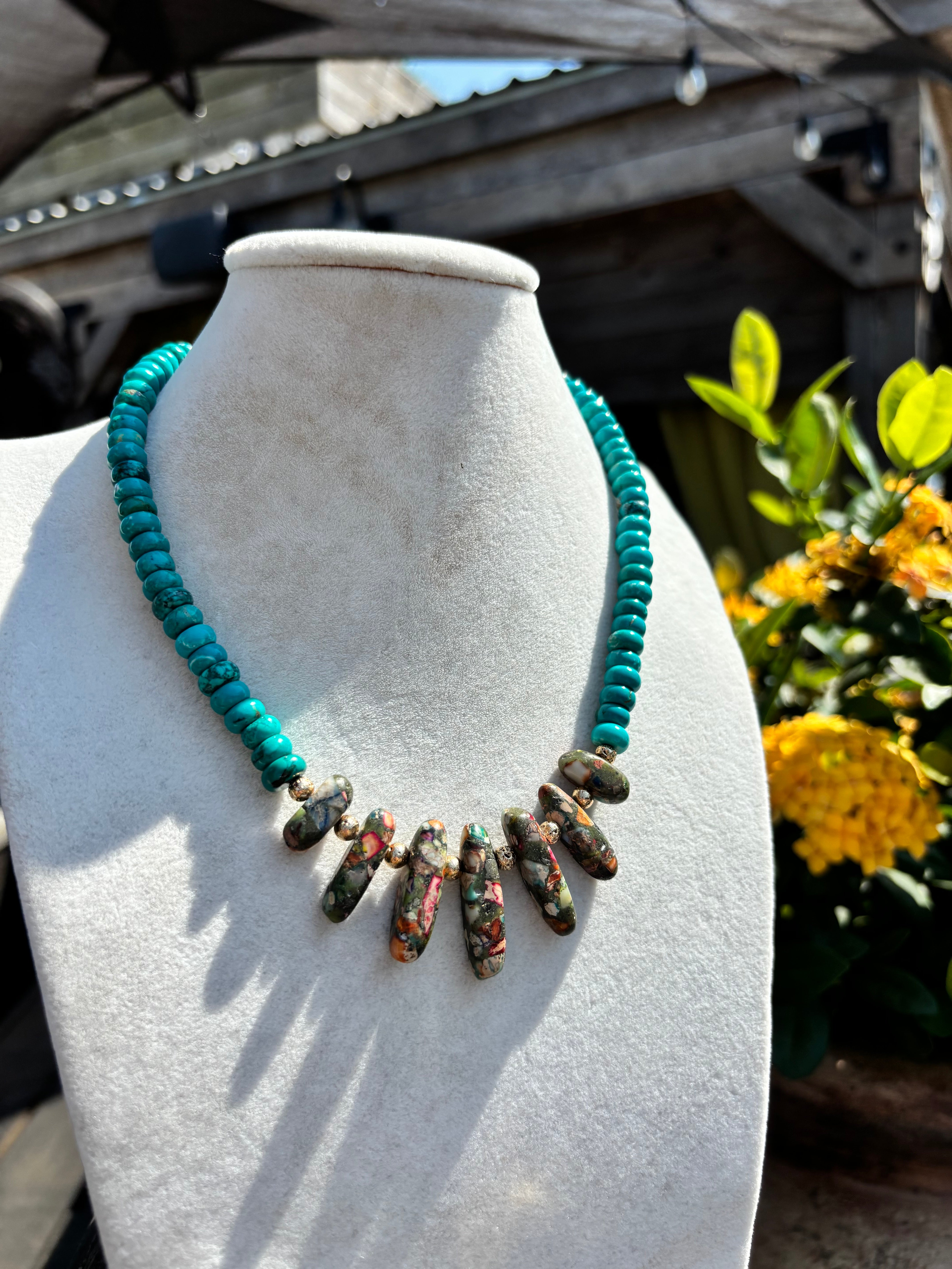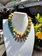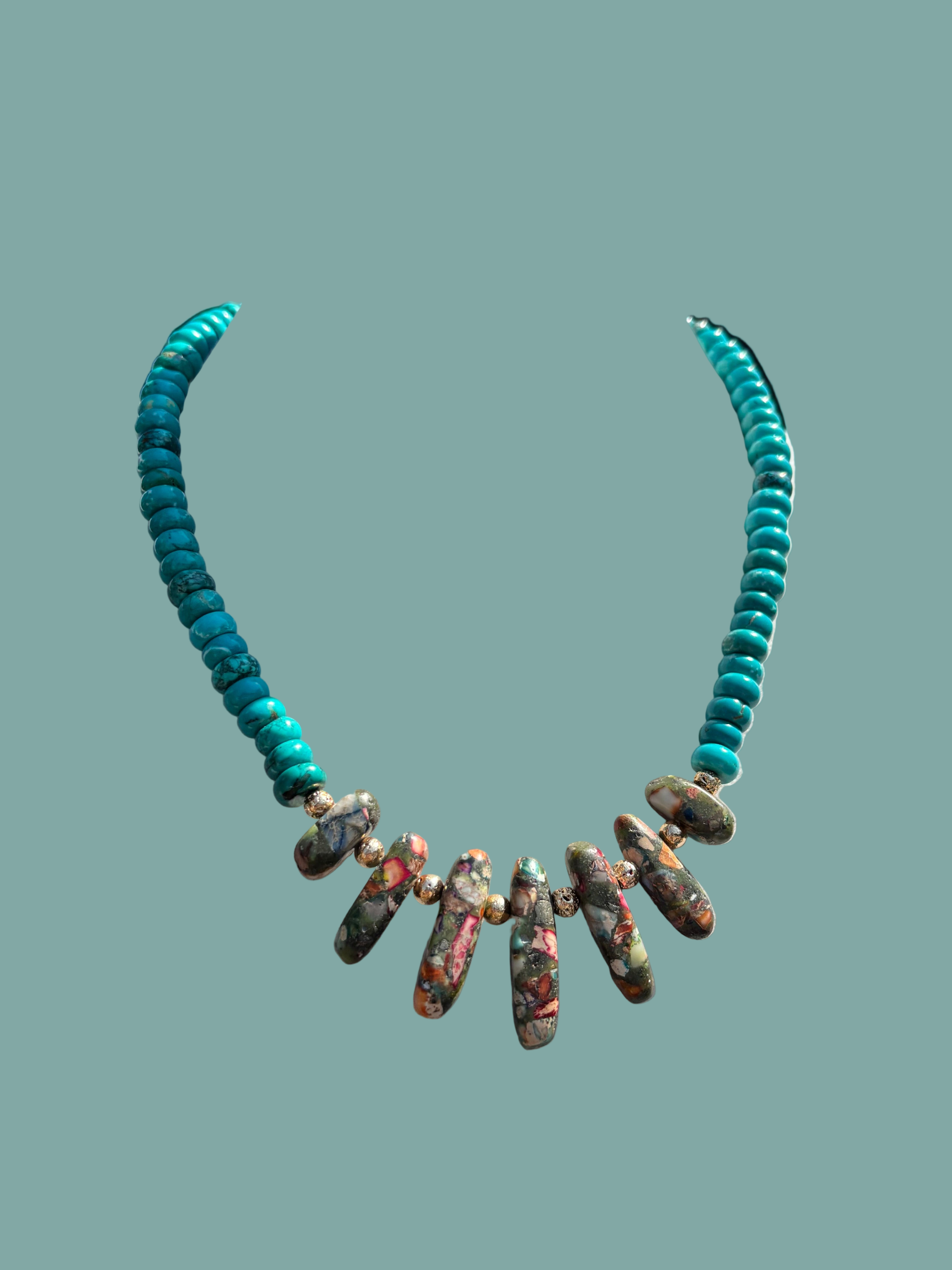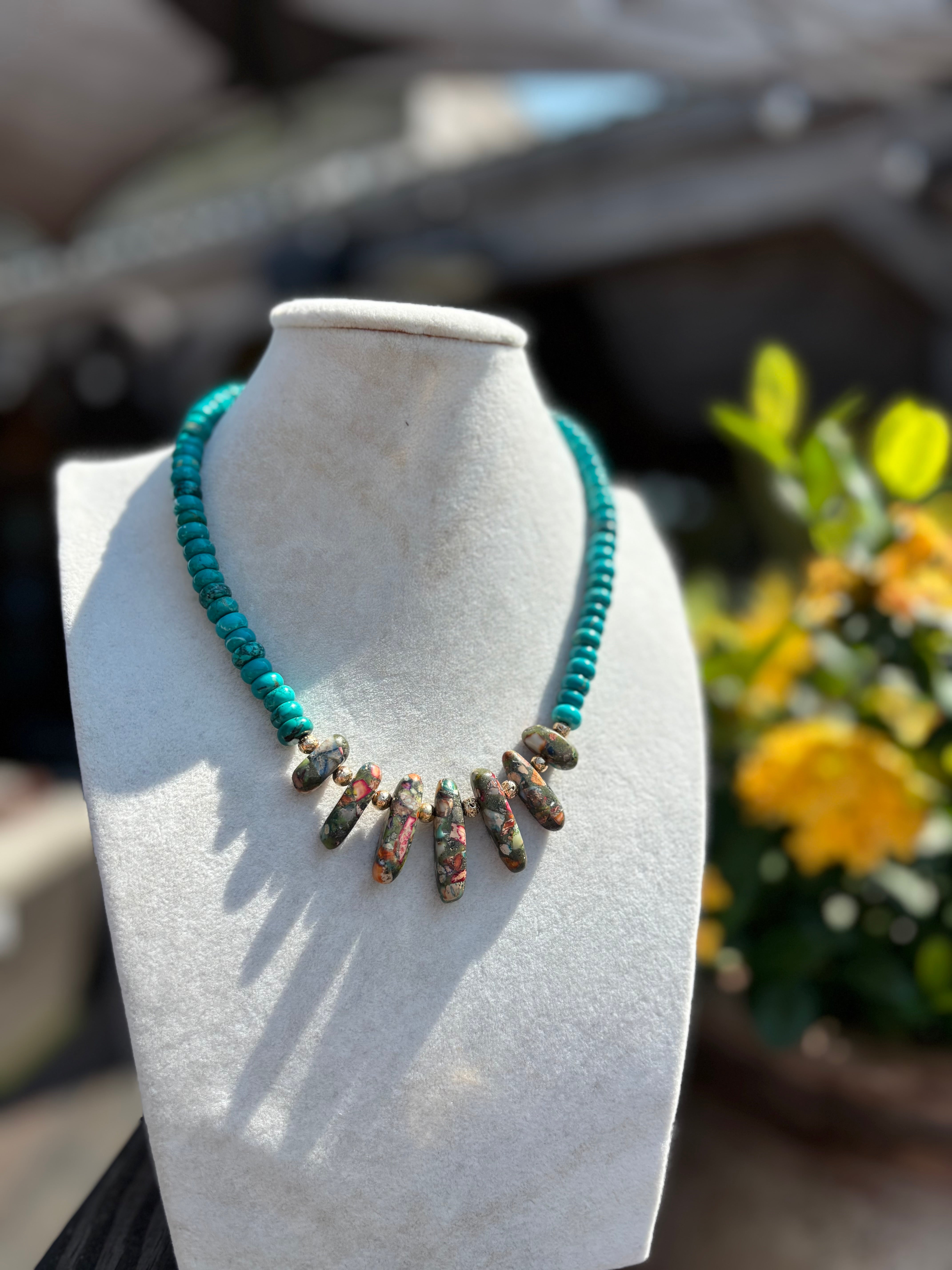 The Sharon Necklace combines vibrant turquoise beads with a centerpiece of multi-colored stones, accented by delicate gold beads. This playful yet elegant design adds a splash of color and charm to any outfit, perfect for everyday wear or special occasions.
