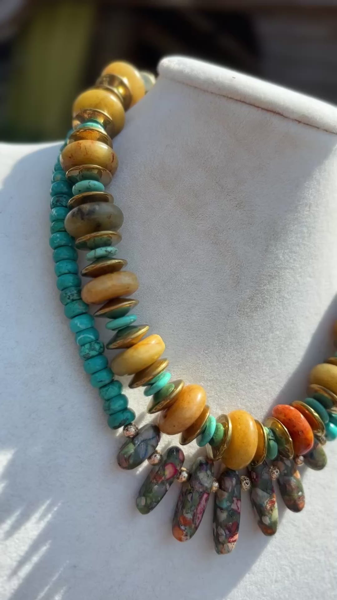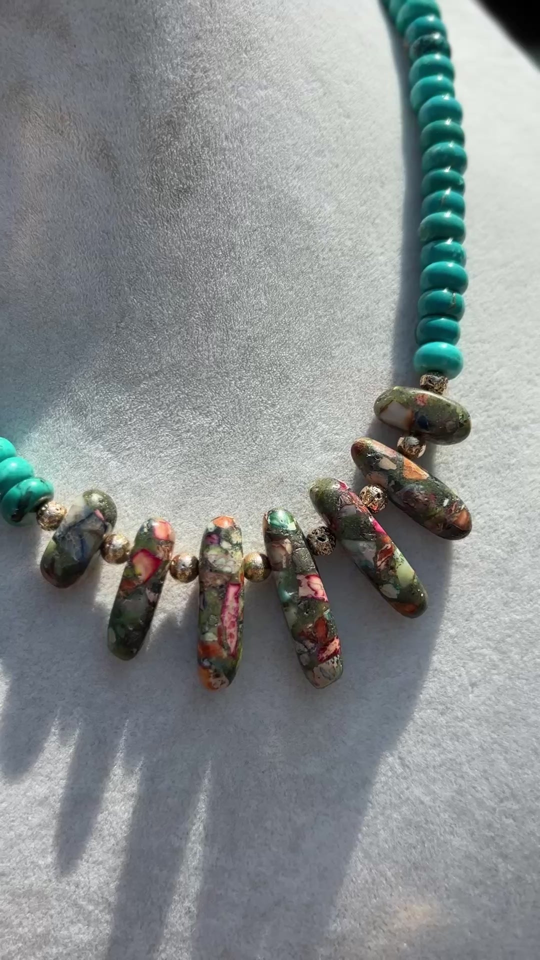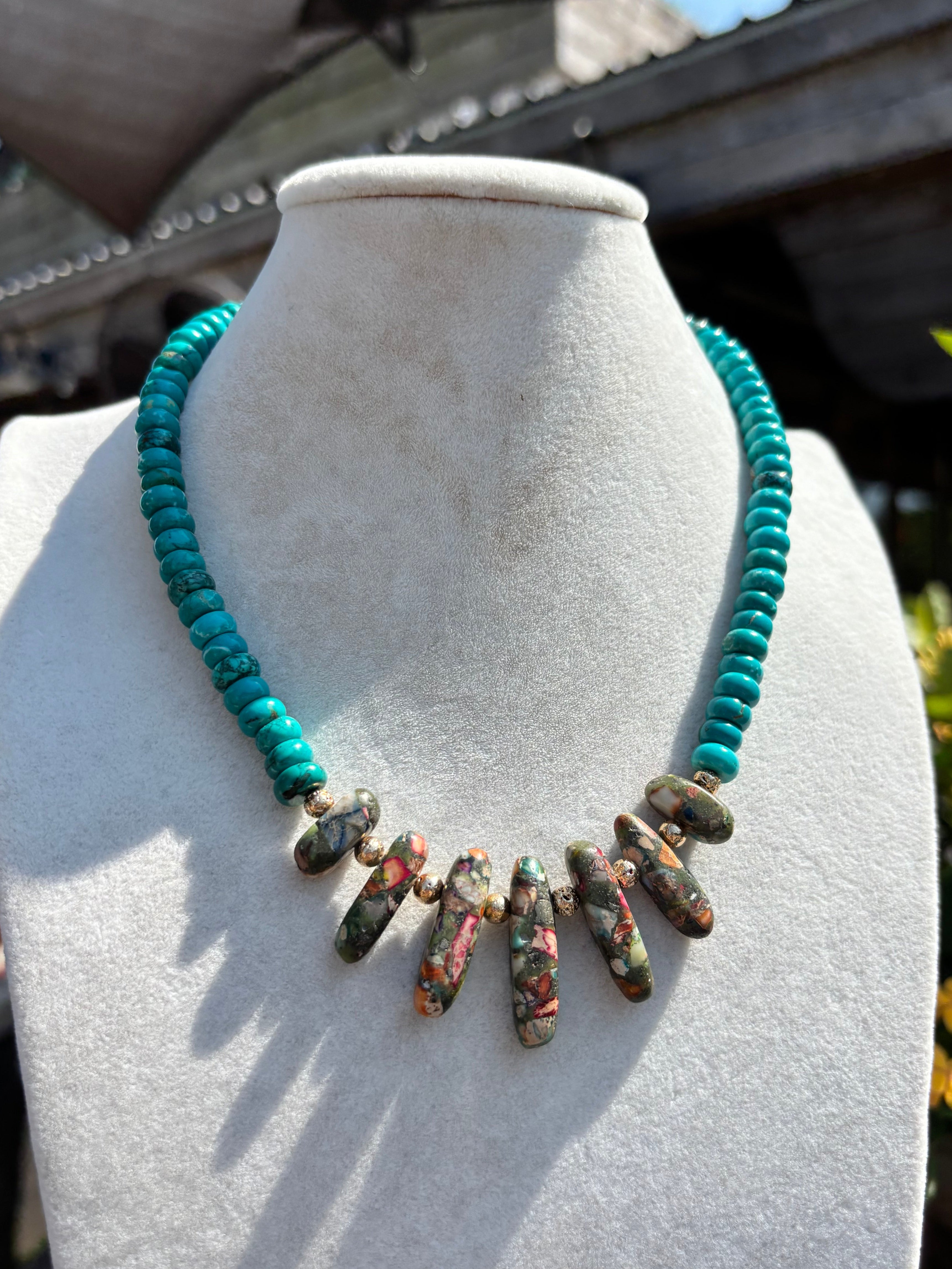 The Sharon Necklace combines vibrant turquoise beads with a centerpiece of multi-colored stones, accented by delicate gold beads. This playful yet elegant design adds a splash of color and charm to any outfit, perfect for everyday wear or special occasions.