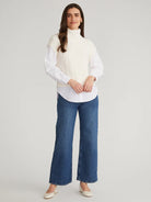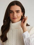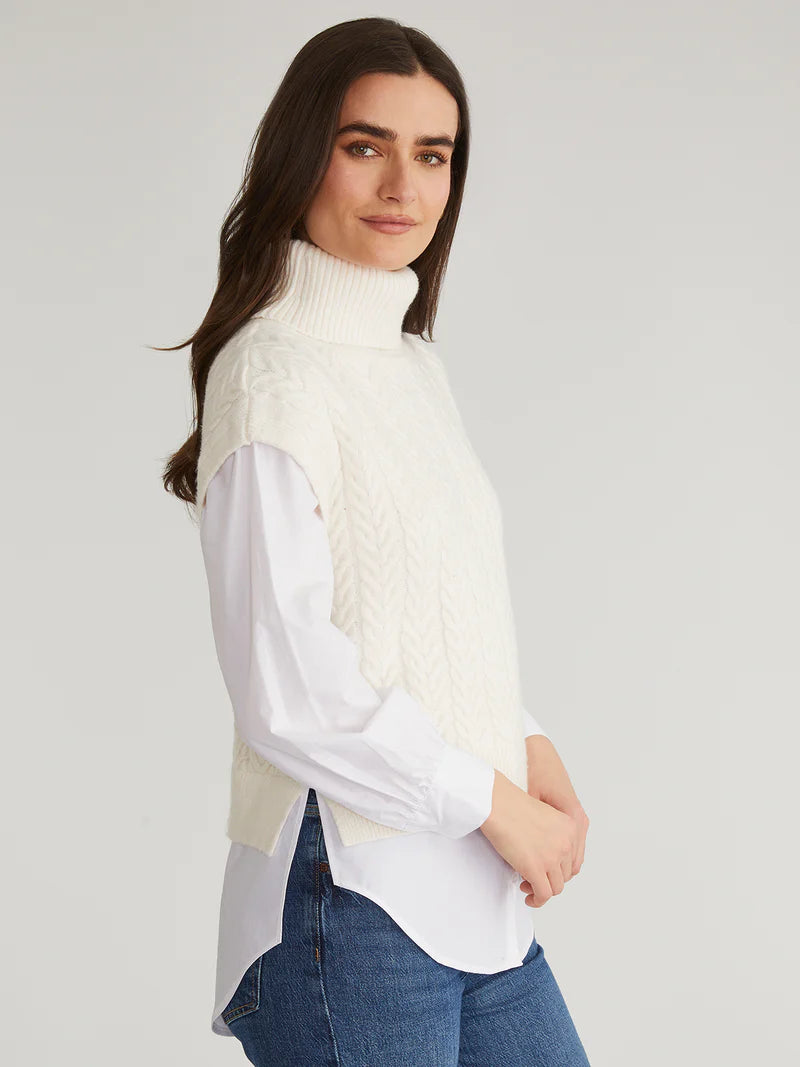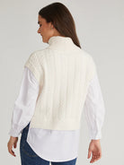 This stylish Sofia sweater features a cable knit design and a cozy turtleneck. It is layered with a woven shirt for a unique and trendy look. Stay warm and fashionable with this mixed media sweater.