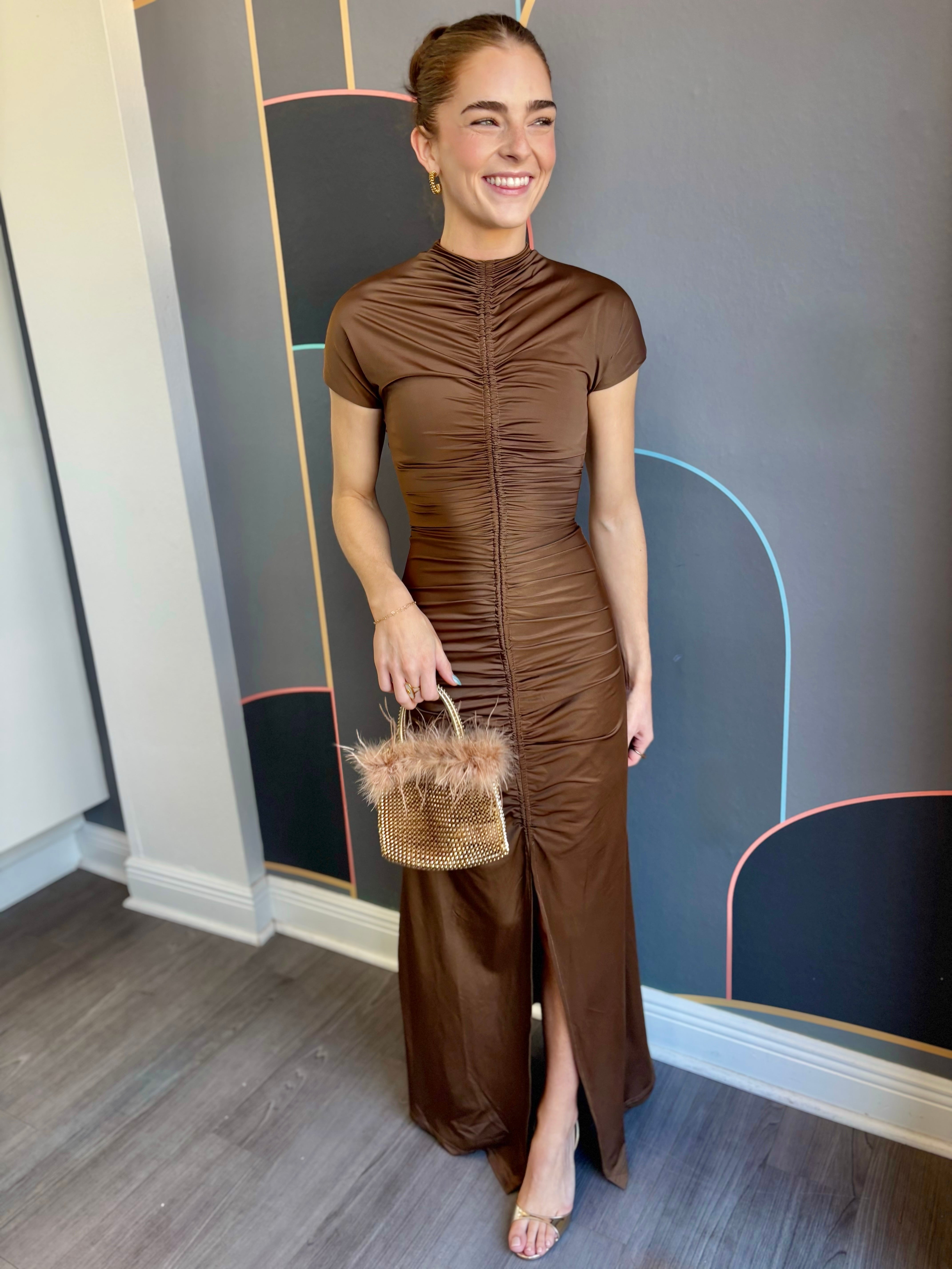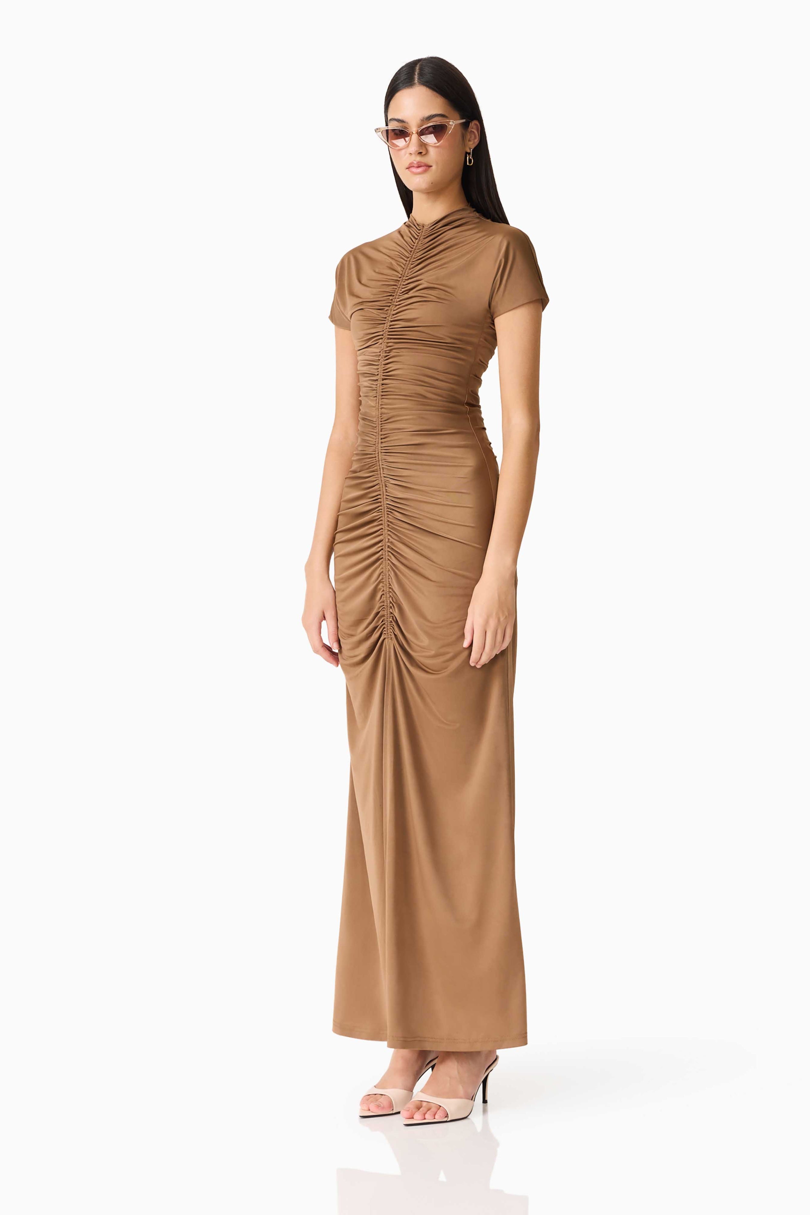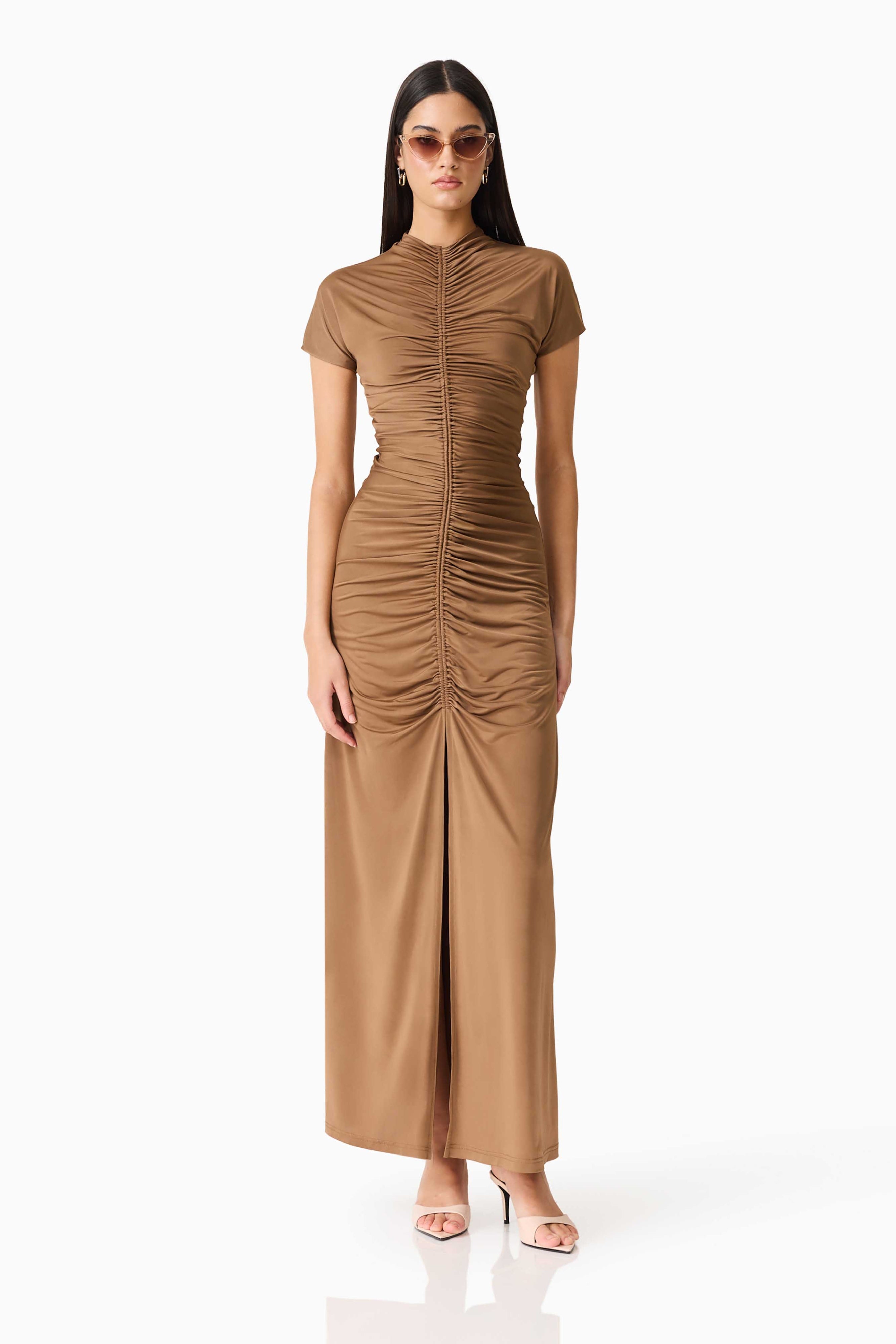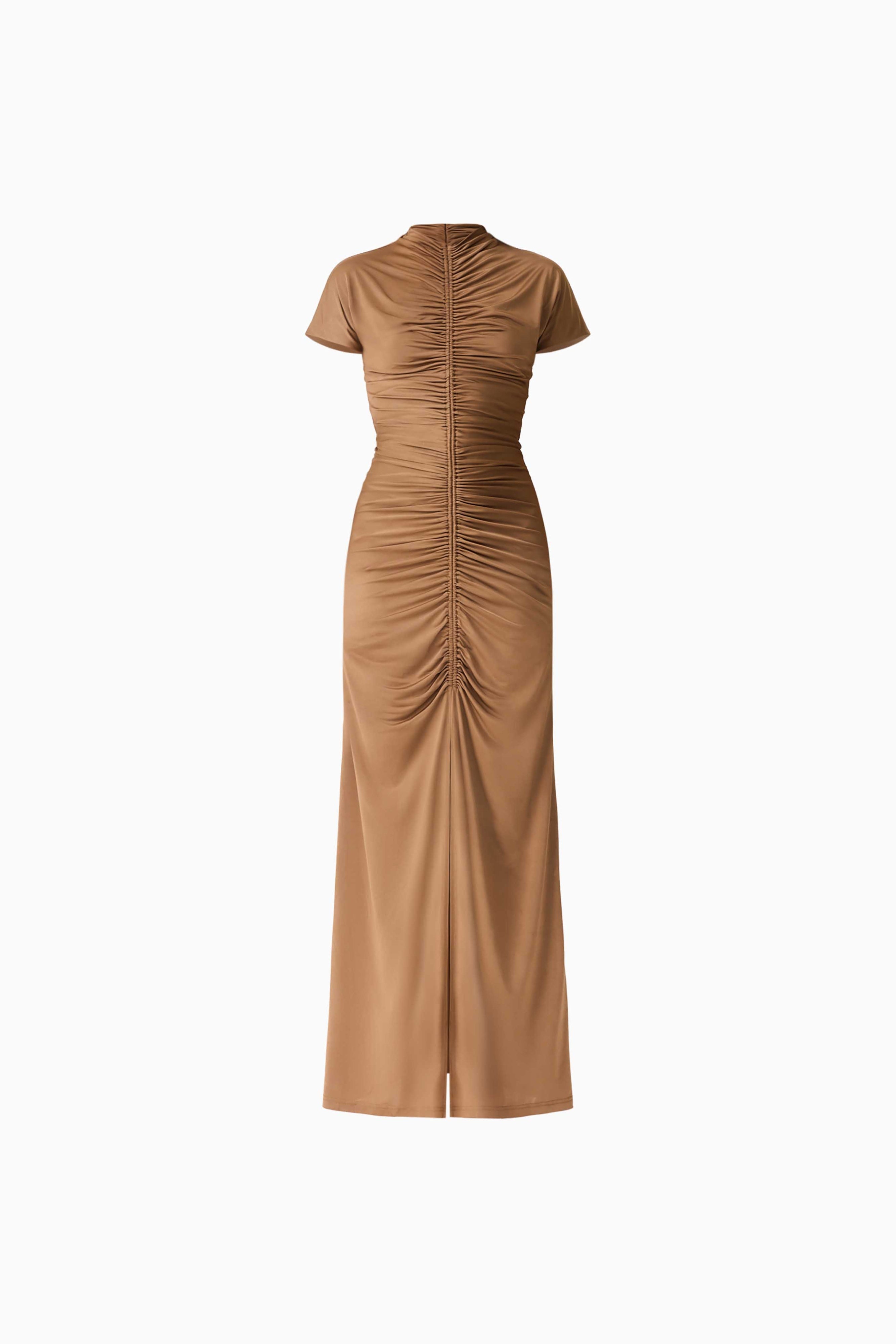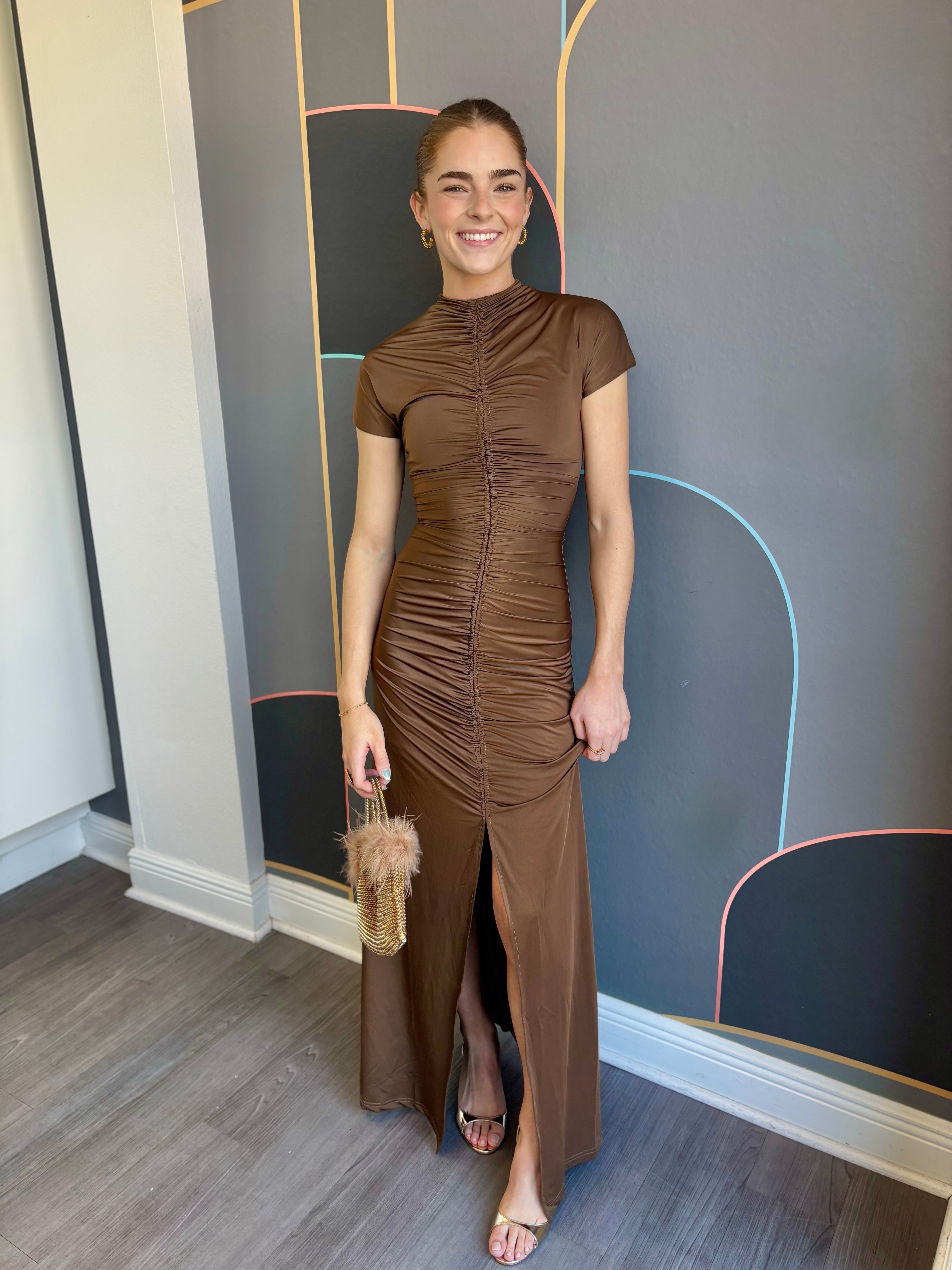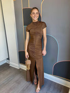 The Tabitha Maxi Dress combines elegance with everyday comfort. This fit-and-flare silhouette features a high neckline and flattering shirring details at the center front and back for a refined look. A center front split adds movement and ease, while the invisible back zipper ensures a seamless finish. Short sleeves and seamless armholes provide all-day comfort, and the stretchy fabric moves with you. Perfect for dressing up or down, this versatile maxi dress is a wardrobe essential.