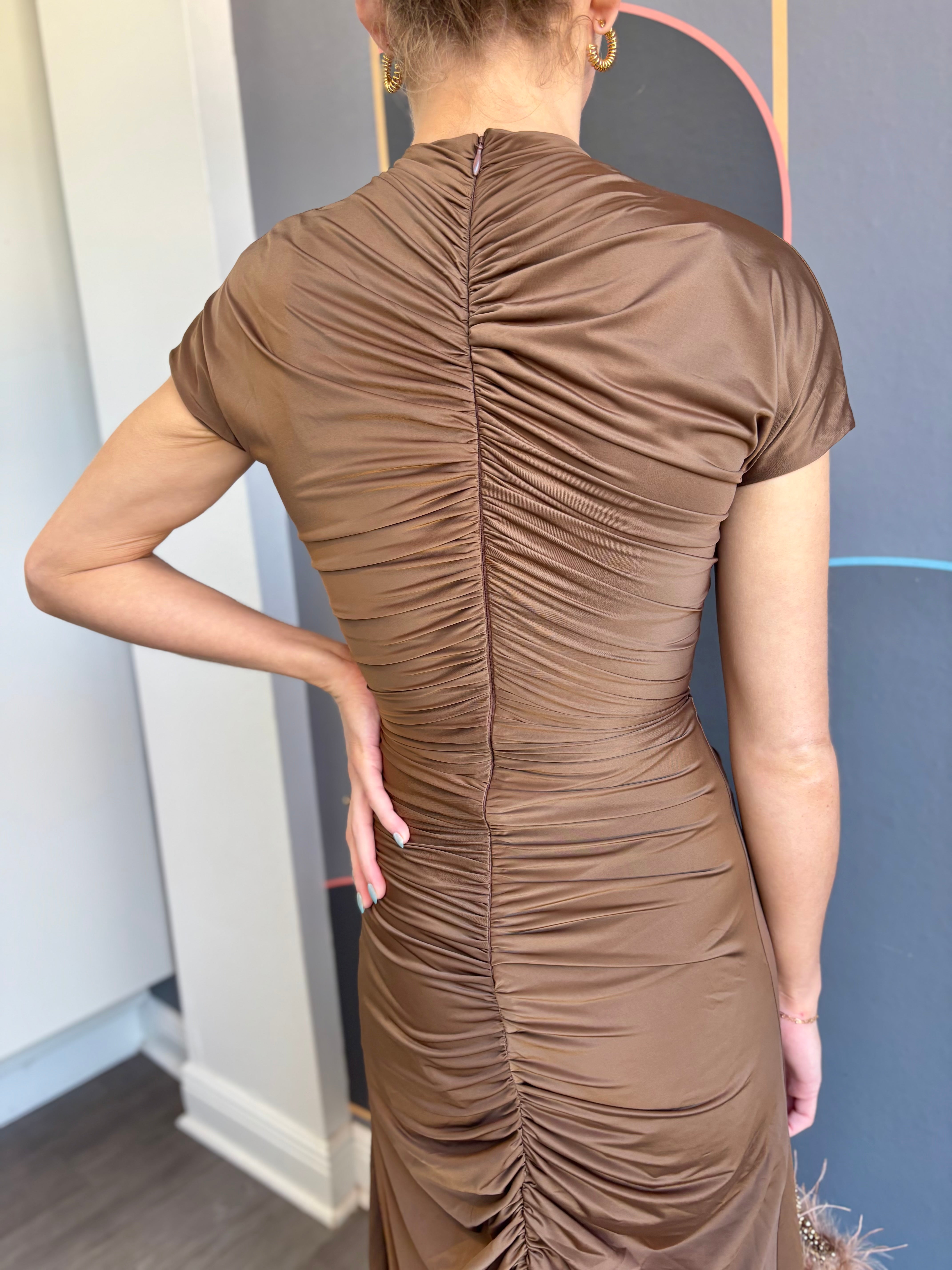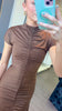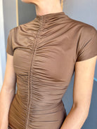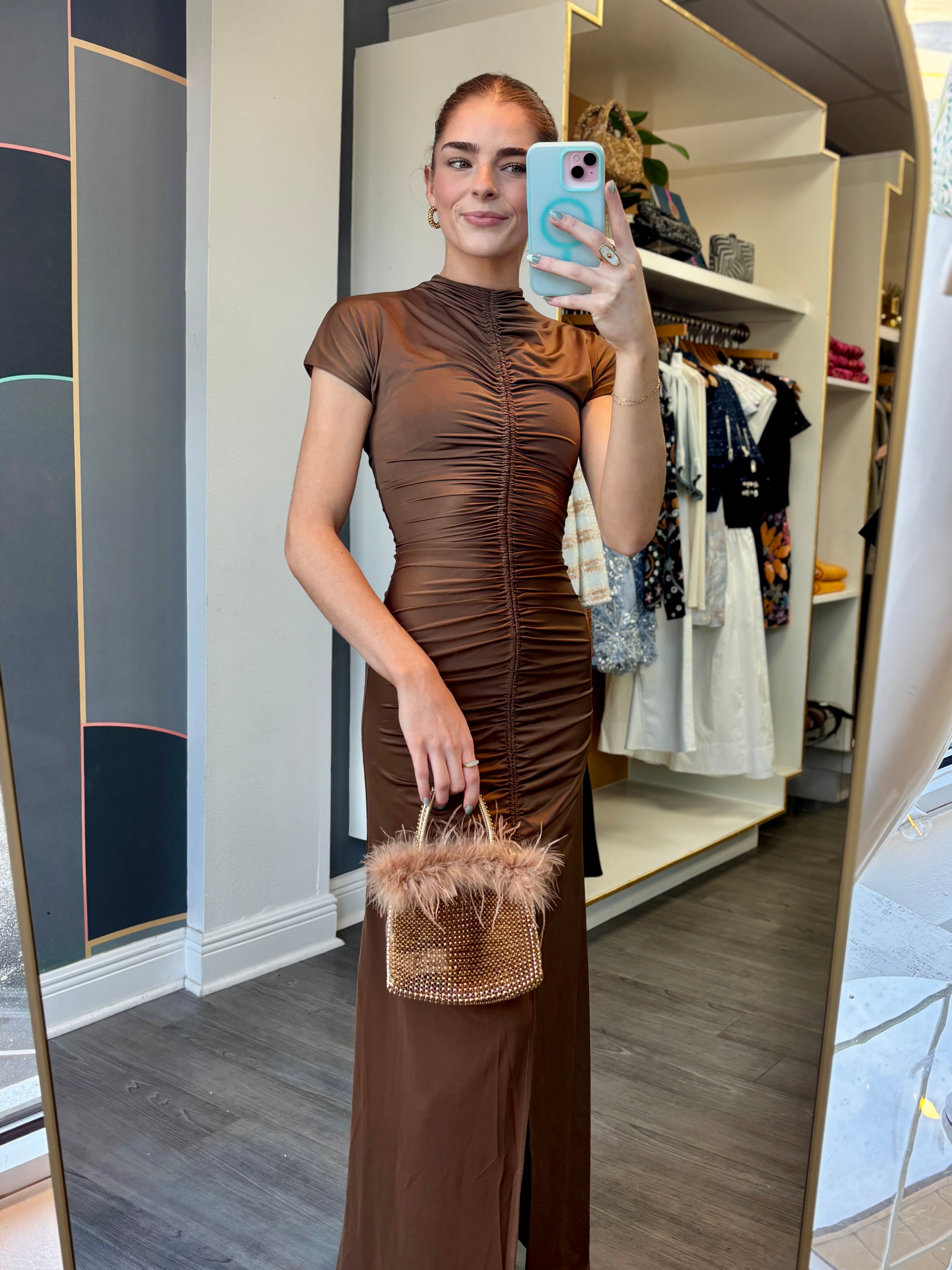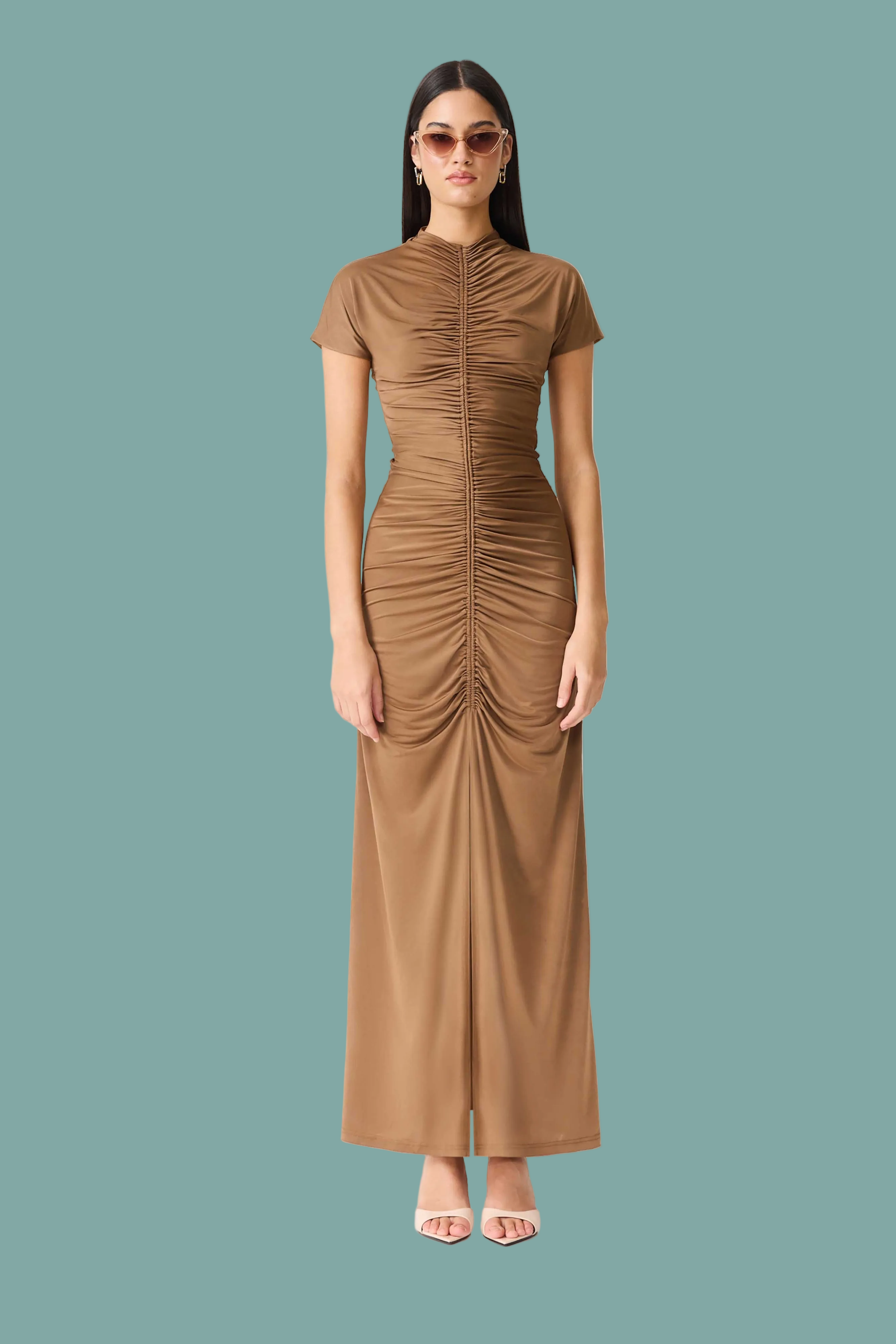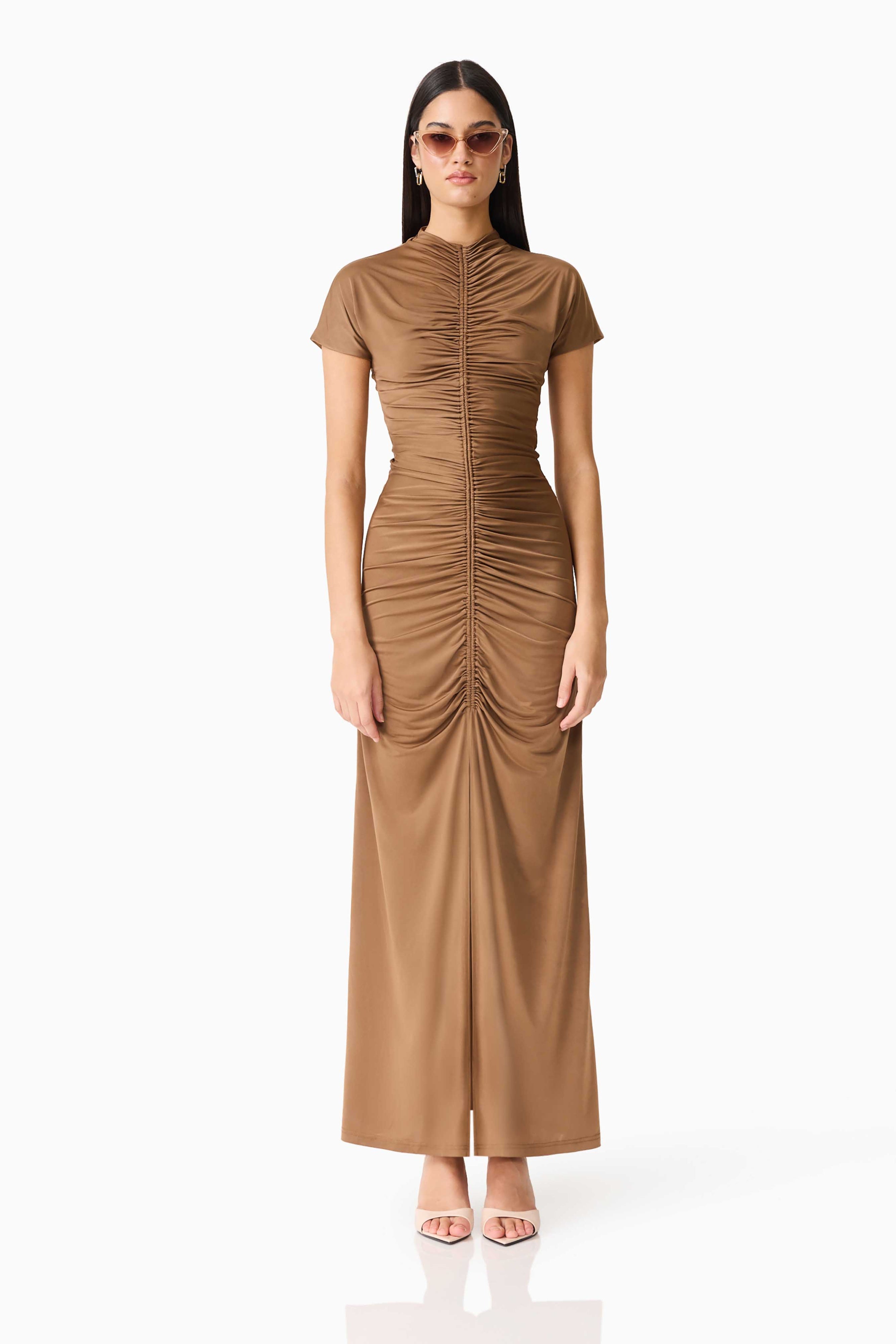 The Tabitha Maxi Dress combines elegance with everyday comfort. This fit-and-flare silhouette features a high neckline and flattering shirring details at the center front and back for a refined look. A center front split adds movement and ease, while the invisible back zipper ensures a seamless finish. Short sleeves and seamless armholes provide all-day comfort, and the stretchy fabric moves with you. Perfect for dressing up or down, this versatile maxi dress is a wardrobe essential.