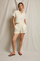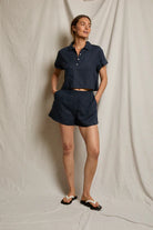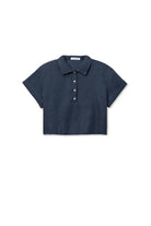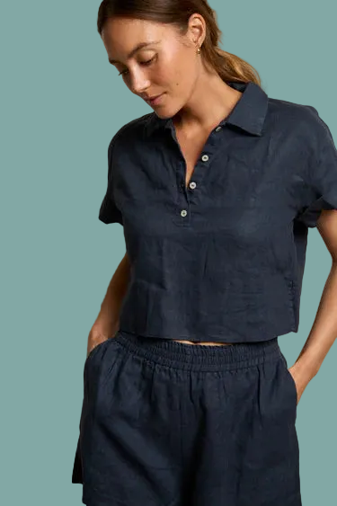 linen, but make it a polo. the tabitha is our answer to dressing in the heat. an airy, 100% linen top that trades the stuffiness of a traditional collared shirt for an open neckline and sharp boxy with a slightly cropped hem. It’s got that crisp texture that only gets better with sunshine.