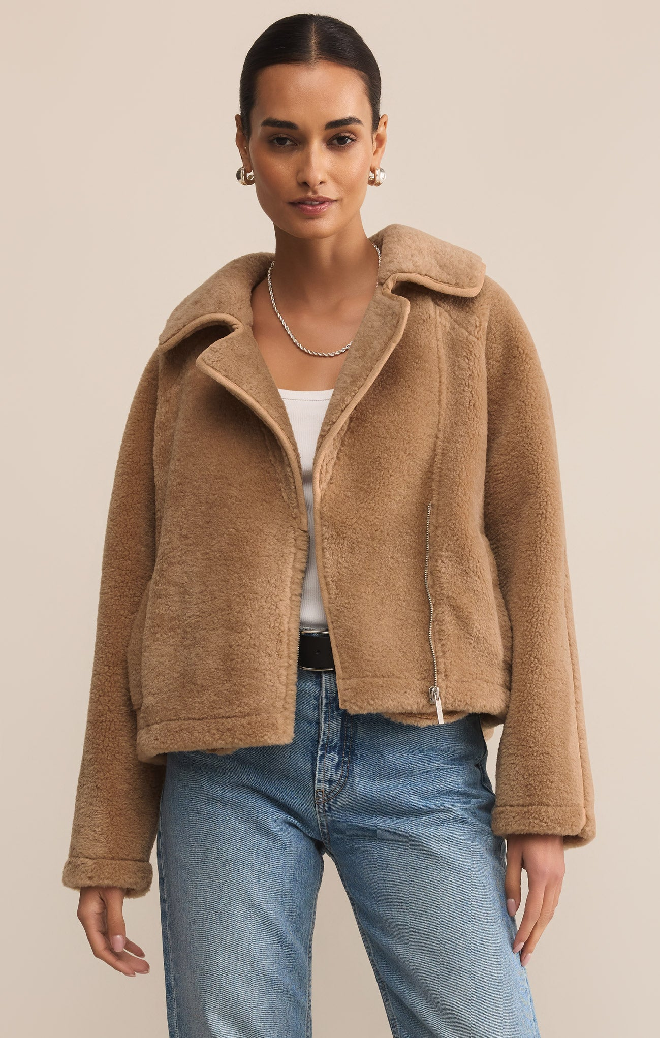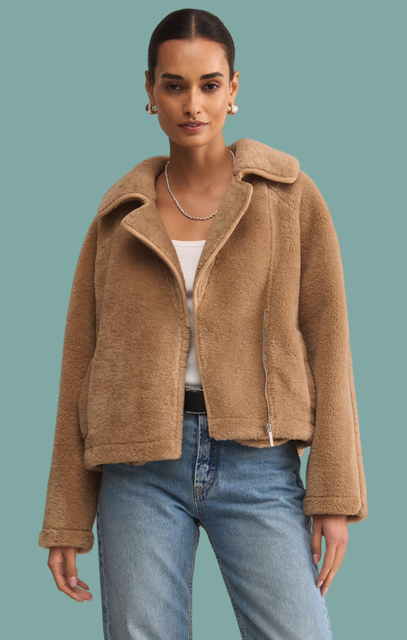 The Townsend Sherpa Jacket blends faux suede and plush sherpa for warmth and style on chilly days. Featuring moto-inspired details, raglan sleeves, and contrast trim, it offers a comfortable regular fit with a zip front and collar. Lightweight yet cozy, this unlined jacket includes welt pockets and a soft, heavy wash finish—perfect for casual outings. Dry clean only to keep it looking its best.