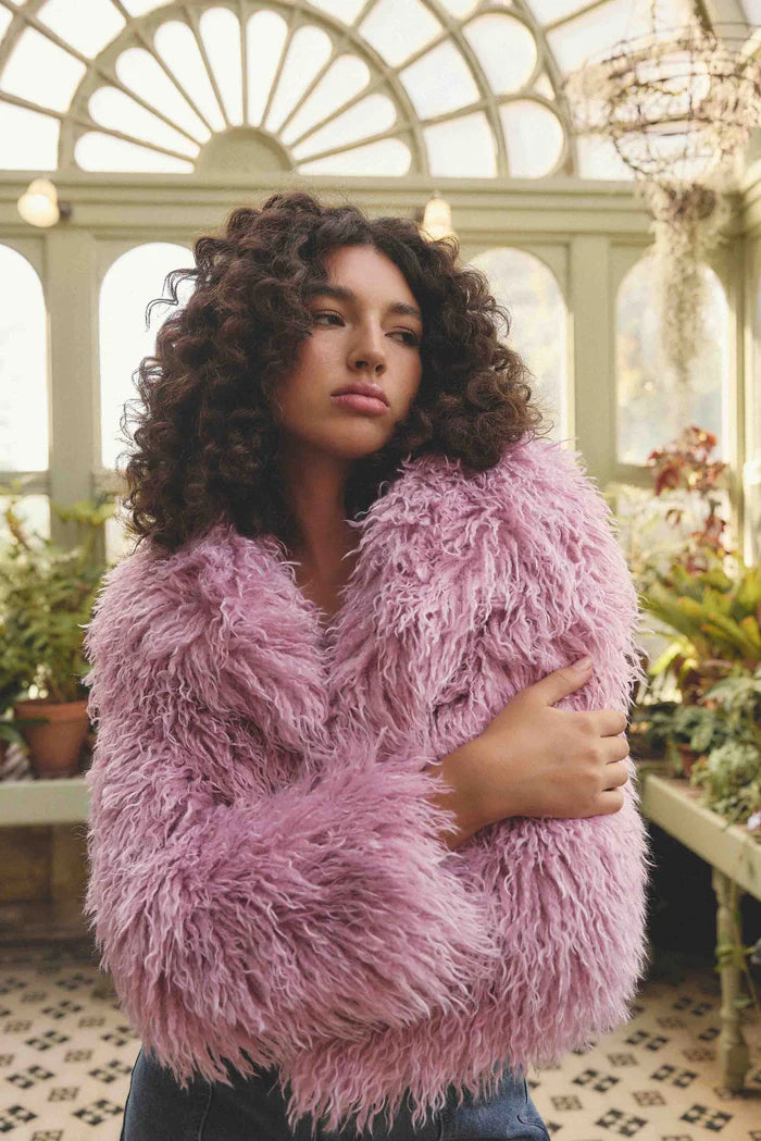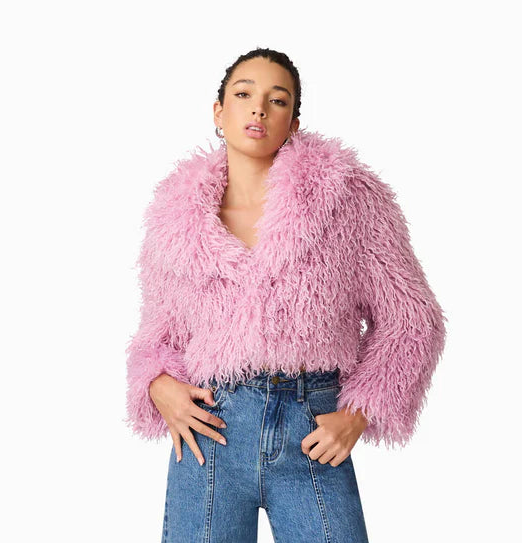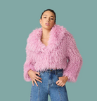 Make a statement with the Trisha Faux Fur Cropped Jacket in Pink. Its soft, textured faux fur and wide lapel add a playful edge, while the cropped length keeps your look fresh and flattering. Perfect over dresses or your favorite high-waisted jeans, this fully lined jacket combines cozy warmth with effortless style. Its structured shape holds up without stretch, ensuring you stay polished no matter where your day takes you.