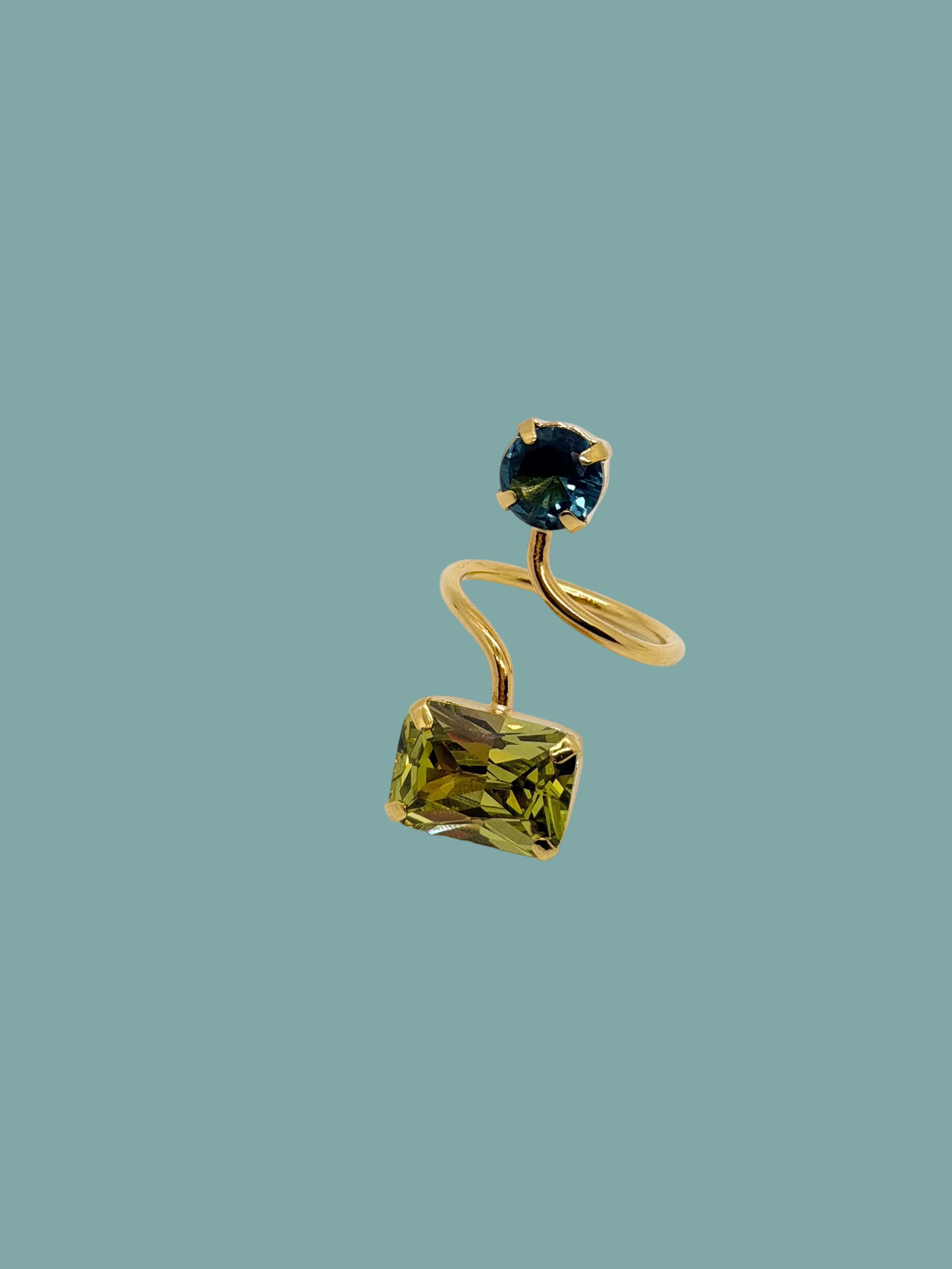 This stunning two-stone ring combines modern elegance with timeless appeal. The sea green circle diamond sits proudly at the top, catching light with brilliant sparkle, while a yellow gold emerald cut stone anchors the design below. The contrasting shapes and complementary hues create a sophisticated yet playful look that works for everyday wear or special occasions. A versatile piece that lets your personal style shine.