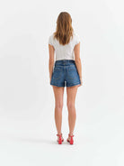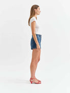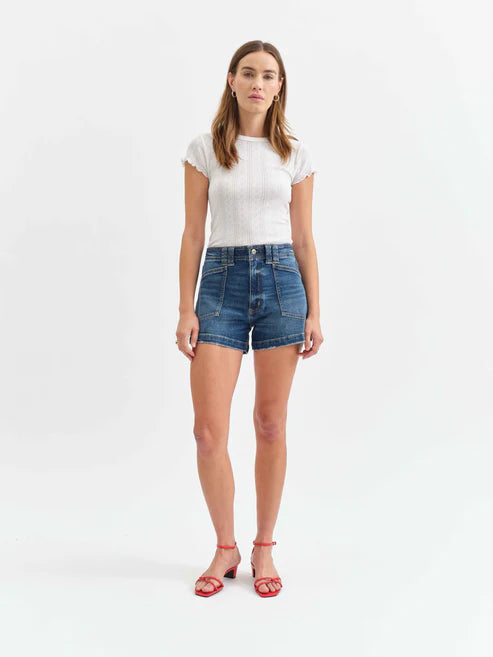 A relaxed, yet polished denim short with stitch front pockets, a high rise waist, and a true indigo wash. Constructed in our "Tough Love" denim, it's mostly rigid but yields to your body in all the right ways.