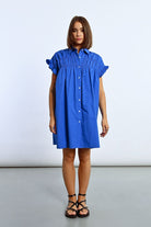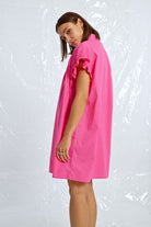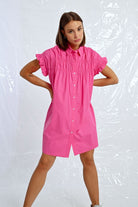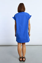 This tunic shirt dress features playful ruffle cap sleeves and a ruched front for added flair. In a stunning royal blue and pink, this dress will make you feel like a queen at any event.